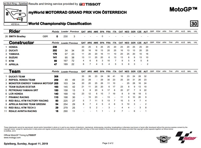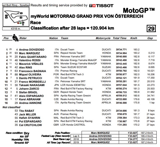 โดยมี Rossi และ Vinales จาก จาก Monster Energy Yamaha MotoGP ตามมาในขณะที่ Miguel Oliveira จาก Red Bull KTM Tech 3 จบลงด้วยการเป็น KTM ที่ดีที่สุดบนสนามในบ้านของโรงงานในออสเตรีย