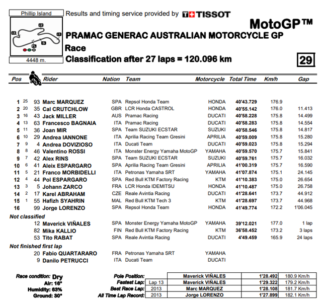ผลการแข่งขัน MotoGP รายการ Pramac Generac Australian Motorcycle Grand Prix ที่สนาม Phillip Island