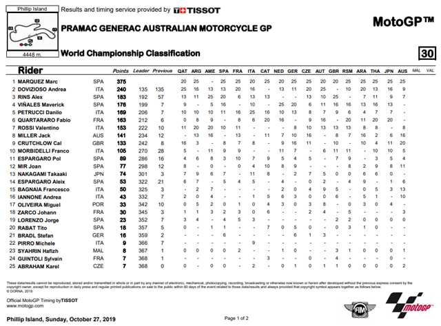 Marquez ยังคงเก็บคะแนนได้อย่างต่อเนื่องเพื่อพา ทีม Repsol Honda คว้าตำแหน่งแชมป์ประเภททีมให้ได้สำเร็จ โดยตามผู้นำอย่าง ทีม Ducati อยู่เพียง 1 แต้ม เท่านั้น ส่วนสนามหน้าจะเป็นรายการ Shell Malaysia Motorcycle Grand Prix ที่ Sepang International Circuit ประเทศมาเลเซียซึ่งเป็นสนามรองสุดท้ายแล้วสำหรับปี 2019 จะเป็นอย่างไรต้องติดตามให้ดี