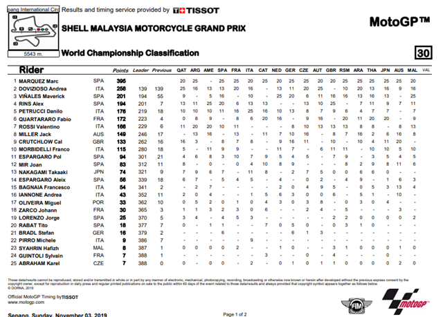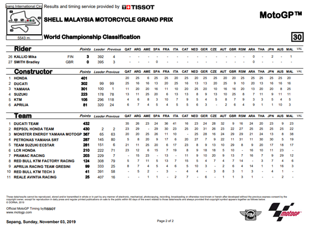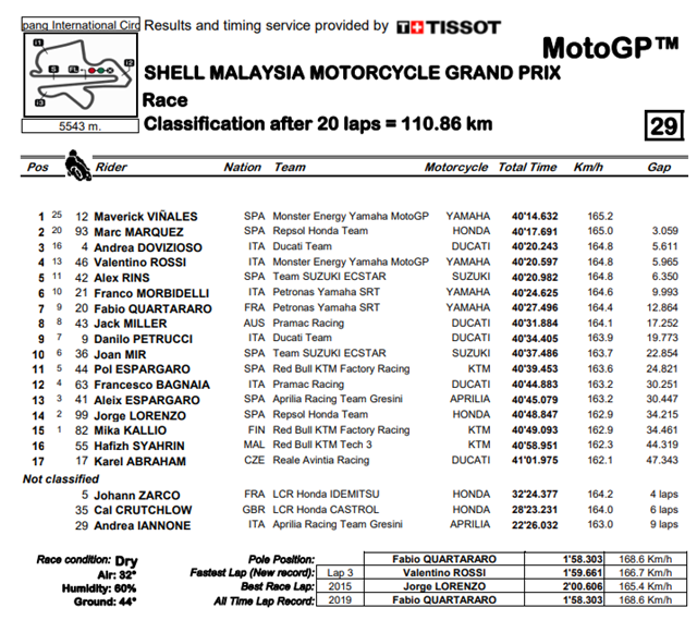 ผลการแข่งขัน MotoGP รายการ Shell Malaysia Motorcycle Grand Prix ที่สนาม Sepang International Circuit