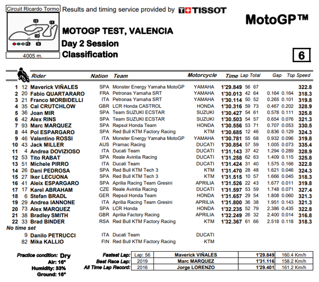 ทางด้านจอมเก๋า Valentino Rossi จบการทดสอบในอันดับที่ 9 โดยมี Jack Miller ตามมาโดยถือว่าเป็นนักแข่งจากฝั่ง Ducati ที่เร็วที่สุด โดยมี Andrea Dovizioso, Tito Rabat และ Michele Pirro ตามมา