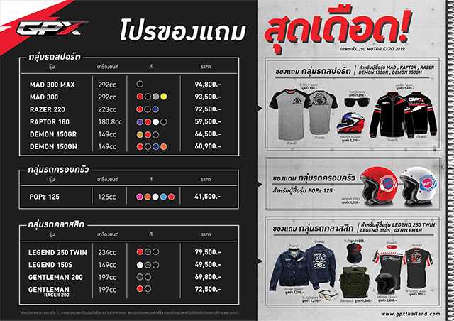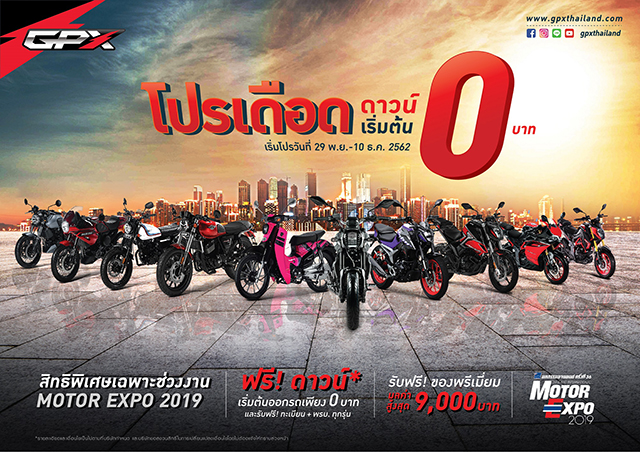 สำหรับงาน Motor Expo 2019 (มหกรรมยานยนต์ ครั้งที่ 36) จะมีขึ้นตั้งแต่วันที่ 29 พ.ย. - 10 ธ.ค. 62 นี้ ณ อิมแพค ชาเลนเจอร์ เมืองทองธานี ใครที่สนใจอยากจะชมรถมอเตอร์ไซค์ดีไซน์เท่ๆ จาก GPX พร้อมรับข้อเสนอสุดพิเศษในงานนี้ สามารถเข้ามาชมกันได้ที่บูธ GPX รหัส G10