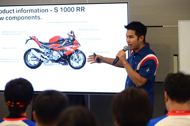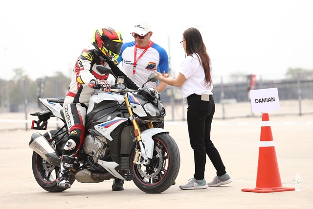 สำหรับผู้เขียนที่ได้เข้าร่วมในระดับ 1 เราเริ่มกันตั้งแต่เช้าตรู่ 7.00 น. ต้องถึงสนามพร้อมกันเพื่อเข้ารับฟังการชี้แจงเรื่องความปลอดภัย ผลิตภัณฑ์ตัวรถ S1000RR รุ่นล่าสุด ที่มีพลังระดับ 207 แรงม้า กับน้ำหนักตัวไม่ถึง 200 กก. ภาพรวมของการฝึกระดับ 1 และแบบฝึกหัดแรกจากทั้งหมด 5 หัวข้อ ก่อนลงสู่การขี่จริงในสนาม ซึ่งแต่ละคนจะมีโค้ชประจำลงไปขี่สังเกต และแนะนำระหว่างฝึกอาศัยผ่านสัญญาณมือซึ่งได้อธิบายกันในห้องเรียนให้เข้าใจร่วมกันไว้แล้ว หลังจากขี่เสร็จกลับมาจอดรถในจุดจอดเรียบร้อยก็ต้องรีบมารายงานผลการฝึกกับโค้ชของตนเองทันที เพื่อสอบถามและฟังข้อแก้ไขต่างๆ จากโค้ช จากนั้นก็ต้องกลับขึ้นไปที่ห้องเรียนเพื่อฟังหัวข้อการฝึกถัดไป แล้วจึงลงมาขี่ฝึกตามหัวข้อนั้นๆ วนไปจนครบ 5 หัวข้อ เรียกว่าต้องพร้อมกันตั้งแต่เช้ายันเย็น โดยเริ่มจากหัวข้อดังต่อไปนี้