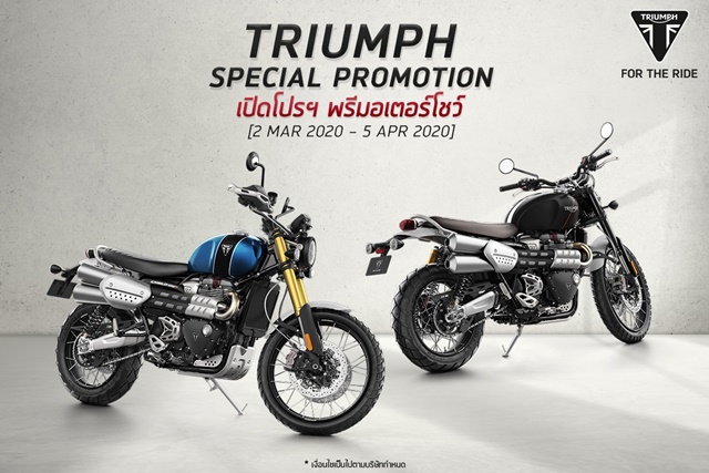 โดยทุกรุ่นฟรีดาวน์ ผ่อนนานสูงสุด 72 เดือน ตลอดจนบริการช่วยเหลือฉุกเฉินบนท้องถนนตลอด 24 ชั่วโมง (Triumph Roadside Assistance) เป็นระยะเวลา 24 เดือน และการรับประกันคุณภาพของรถอีก 24 เดือน ไม่จำกัดระยะทาง พร้อมกันนี้ยังมีข้อเสนอพิเศษของรุ่นอื่นๆ อีกมากมายที่จัดหนักจัดเต็ม โดยโปรโมชั่นดังกล่าวเริ่มตั้งแต่วันนี้จนถึงวันที่ 5 เมษายน 2563