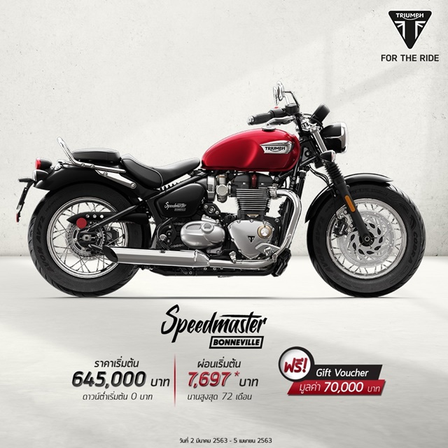 - ปิดท้ายที่ บอนเนวิลล์ สปีดมาสเตอร์ (Bonneville Speedmaster) ราคาเริ่มต้น 645,000 บาท รับฟรี Gift Voucher แทนเงินสดมูลค่า 70,000 บาท