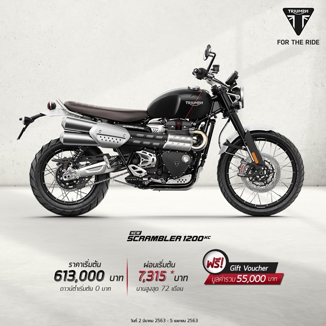 - ประเดิมที่รถมอเตอร์ไซค์โมเดิร์นคลาสสิกที่เป็นที่สุดของการขับขี่เพื่อสายลุยตัวจริง สแครมเบลอร์ 1200 เอ็กซ์ซี (Scrambler 1200 XC) ราคา 613,000 บาท และ สแครมเบลอร์ 1200 เอ็กซ์อี (Scrambler 1200 XE) ราคา 656,000 บาท รับฟรีทันที Gift Voucher แทนเงินสดมูลค่า 50,000 บาท พร้อม Gift Voucher สำหรับเสื้อผ้า มูลค่า 5,000 บาท