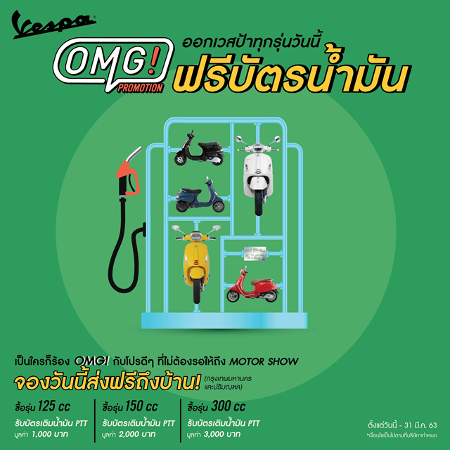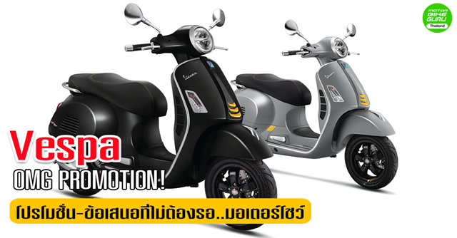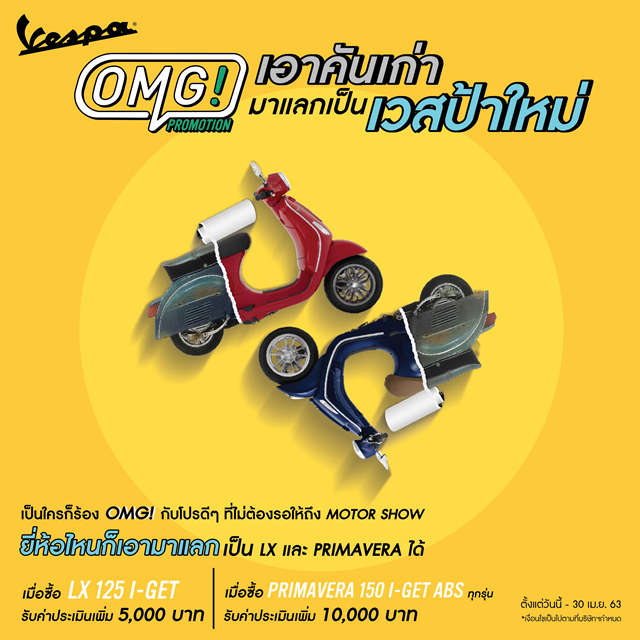 บริษัท เวสปิอาริโอ (ประเทศไทย) จำกัด ผู้นำเข้าและจัดจำหน่ายรถพรีเมี่ยมสกู๊ตเตอร์ชั้นนำ 'พิอาจิโอ' และ 'เวสป้า' พร้อมด้วยรถมอเตอร์ไซค์ระดับตำนาน 'อาพริเลีย' และ 'โมโต กุซซี่' สัญชาติอิตาเลียนแต่เพียงผู้เดียวในประเทศไทย เอาใจชาวสองล้อผู้ที่ชื่นชอบและหลงใหลในรถสกู๊ตเตอร์พรีเมี่ยม 'เวสป้า' จากอิตาลีด้วย 'OMG PROMOTION!' พร้อมข้อเสนอสุดเซอร์ไพรส์ที่ให้คุณได้เป็นเจ้าของรถเวสป้าก่อนมอเตอร์โชว์ ทั้ง 'เก่าแลกใหม่ (OLD TO NEW)' เพียงแค่คุณนำรถสกู๊ตเตอร์หรือรถมอเตอร์ไซค์รุ่นใด ยี่ห้อใดก็ได้ มาแลกซื้อรถเวสป้า LX และ PRIMAVERA พร้อมรับพิเศษมูลค่าการประเมินราคาเก่าให้สูงขึ้น หรือเลือก "ขี่ชิลๆ ฟรี 2 เดือน (SAVE 2 MONTHS)" ในรุ่น LX และ PRIMAVERA กับการฟรีค่างวด 2 งวด รวมถึง 'ฟรีบัตรน้ำมันมูลค่าสูงสุด 3,000 บาท (GET A GIFT CARD)' และบริการส่งรถเวสป้าฟรีถึงบ้าน