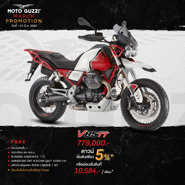 Moto Guzzi V85 TT 759,000 บาท ดาวน์เริ่มต้น 5%, ฟรี ประกันภัยชั้น 1 ค่าจดทะเบียนและ พ.ร.บ., บริการ Roadside Assistance 1 ปี, Alpinestars Gift Voucher มูลค่า 10,000 บาท และ ผลิตภัณฑ์ดูแลรถ IPONE CARELINE 1 Set