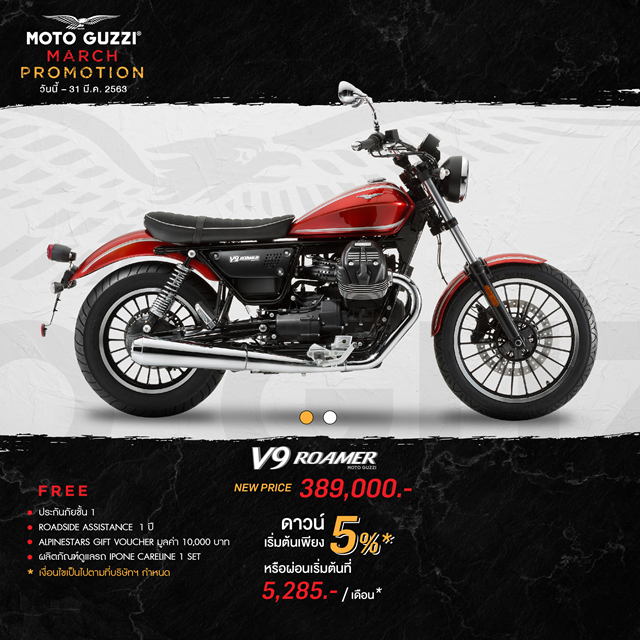 Moto Guzzi V9 ROAMER 389,000 บาท ดาวน์เริ่มต้น 5% ฟรี ประกันภัยชั้น 1, บริการ Roadside Assistance 1 ปี, Alpinestars Gift Voucher มูลค่า 10,000 บาท และผลิตภัณฑ์ดูแลรถ IPONE CARELINE 1 Set