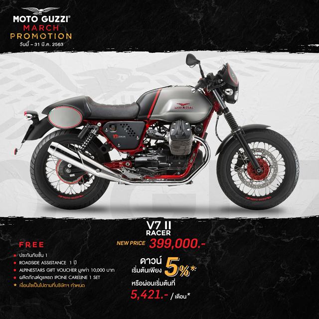 Moto Guzzi V7 II RACER 399,000 บาท ดาวน์เริ่มต้น 5%, ฟรี ประกันภัยชั้น 1, บริการ Roadside Assistance 1 ปี, Alpinestars Gift Voucher มูลค่า 10,000 บาท และ ผลิตภัณฑ์ดูแลรถ IPONE CARELINE 1 Set