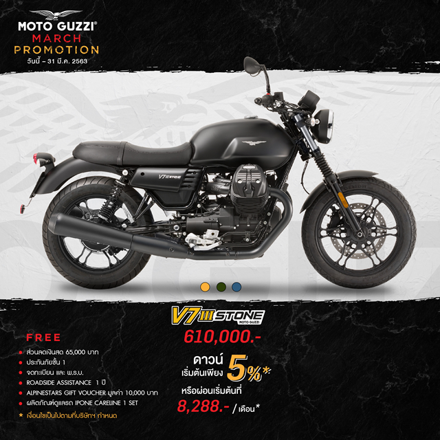 Moto Guzzi V7 III STONE 610,000 บาท ดาวน์เริ่มต้น 5%, ส่วนลดเงินสด 65,000 บาท, ฟรี ประกันภัยชั้น 1, ค่าจดทะเบียนและ พ.ร.บ., บริการ Roadside Assistance 1 ปี, Alpinestars Gift Voucher มูลค่า 10,000 บาท และ ผลิตภัณฑ์ดูแลรถ IPONE CARELINE 1 Set