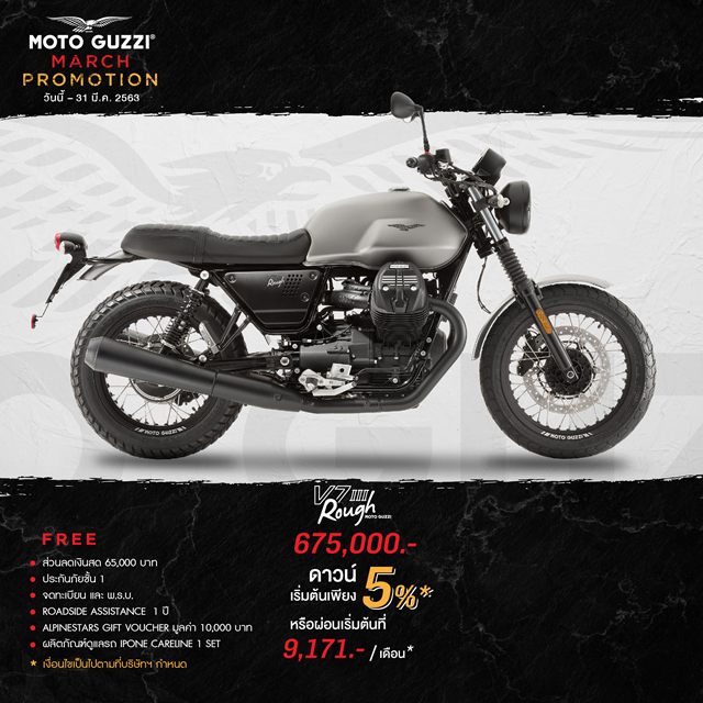 Moto Guzzi V7 III ROUGH 675,000 บาท ดาวน์เริ่มต้น 5%, ส่วนลดเงินสด 65,000 บาท, ฟรี ประกันภัยชั้น 1, ค่าจดทะเบียนและ พ.ร.บ., บริการ Roadside Assistance 1 ปี, Alpinestars Gift Voucher มูลค่า 10,000 บาท และ ผลิตภัณฑ์ดูแลรถ IPONE CARELINE 1 Set