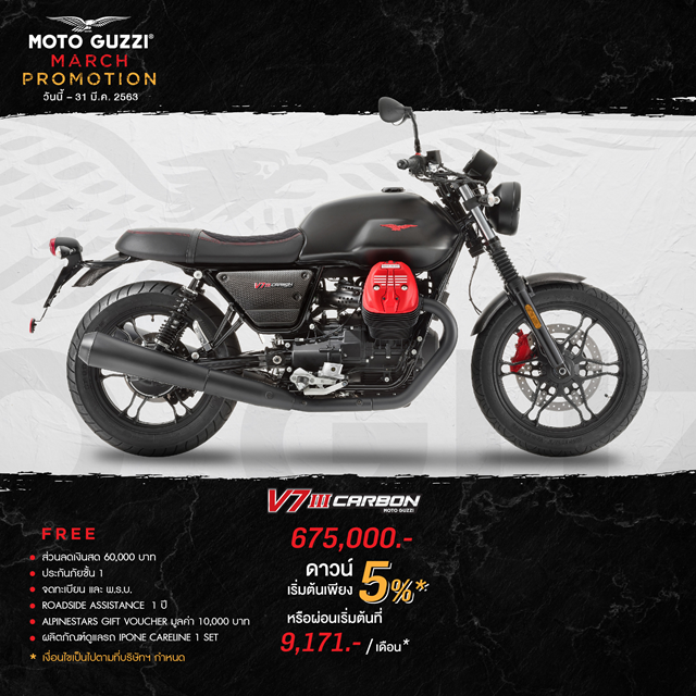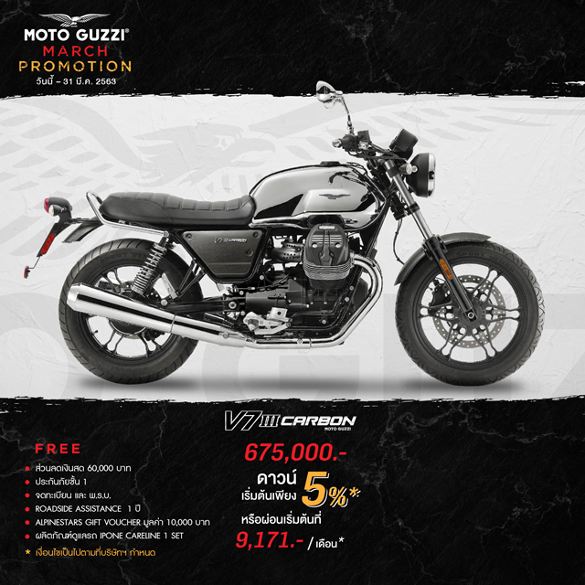 Moto Guzzi V7 III CARBON 675,000 บาท ดาวน์เริ่มต้น 5%, ส่วนลดเงินสด 60,000 บาท, ฟรี ประกันภัยชั้น 1, ค่าจดทะเบียนและ พ.ร.บ., บริการ Roadside Assistance 1 ปี, Alpinestars Gift Voucher มูลค่า 10,000 บาท และ ผลิตภัณฑ์ดูแลรถ IPONE CARELINE 1 Set