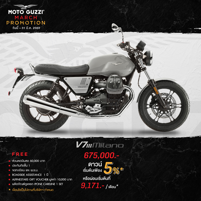 Moto Guzzi V7 III MILANO 675,000 บาท ดาวน์เริ่มต้น 5%, ส่วนลดเงินสด 60,000 บาท, ฟรี ประกันภัยชั้น 1, ค่าจดทะเบียนและ พ.ร.บ., บริการ Roadside Assistance 1 ปี, Alpinestars Gift Voucher มูลค่า 10,000 บาท และ ผลิตภัณฑ์ดูแลรถ IPONE CARELINE 1 Set