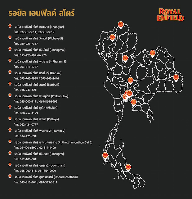 รอยัล เอนฟิลด์ เอ็กซ์คลูซีฟ สโตร์ทั้ง 14 แห่ง ให้บริการครอบคลุมพื้นที่หัวเมืองใหญ่ ได้แก่ กรุงเทพฯ (ทองหล่อ วิภาวดี พระราม 5 พระราม 2) นครปฐม ชลบุรี (พัทยา) ลพบุรี พิษณุโลก เชียงใหม่ เชียงราย อุดรธานี อุบลราชธานี ภูเก็ต และสงขลา (หาดใหญ่) ส่วนศูนย์บริการอย่างเป็นทางการ ได้แก่ รอยัล เอนฟิลด์ อ้อมใหญ่, รอยัล เอนฟิลด์ ธนบุรี, รอยัล เอนฟิลด์ โคราช, รอยัล เอนฟิลด์ อุบลราชธานี (ยักษ์โมโต), รอยัล เอนฟิลด์ พัทยาใต้, รอยัล เอนฟิลด์ ลำพูน, รอยัล เอนฟิลด์ ลำปาง, รอยัล เอนฟิลด์ ลาดกระบัง, รอยัล เอนฟิลด์ สุวรรณภูมิ, รอยัล เอนฟิลด์ สะแกงาม, รอยัล เอนฟิลด์ สุราษฎร์ธานี, รอยัล เอนฟิลด์ ระยอง, รอยัล เอนฟิลด์ นครพนม และรอยัล เอนฟิลด์ ขอนแก่น
