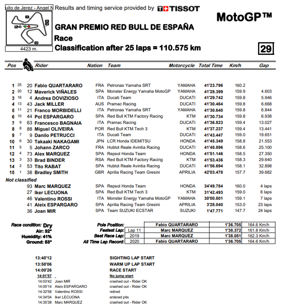 MotoGP กลับมาแข่งอีกครั้งหลังต้องหยุดไปเพราะ Covid-19 โดยมาเริ่มกันที่ #SpanishGP ในรายการ Gran Premio Red Bull de Espana ใน Circuito de Jerez ที่มีเหตุการณ์เกิดขึ้นมากมาย และเป็นครั้งแรกของ Fabio Quartararo ทีม Petronas Yamaha SRT สามารถเก็บชัยชนะในตำแหน่งที่ 1 ได้สำเร็จเป็นครั้งแรกในการแข่งขัน MotoGP