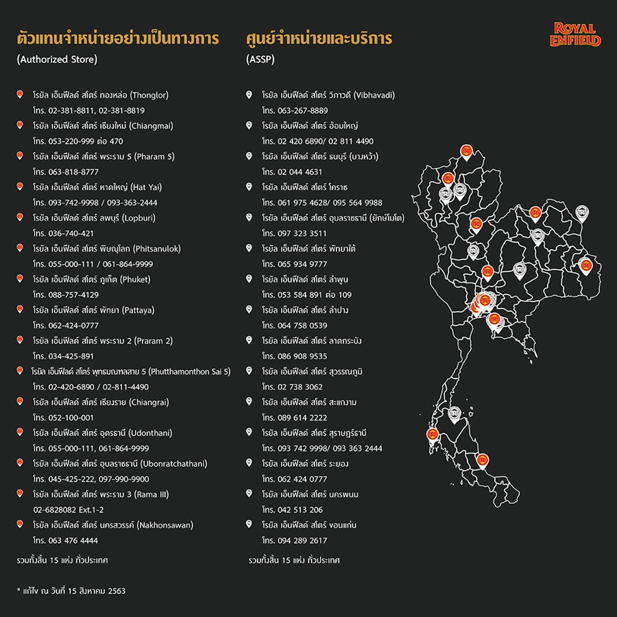ตำแหน่งของรอยัล เอนฟิลด์ สโตร์ต่างๆ ทั่วประเทศไทยมีดังนี้: