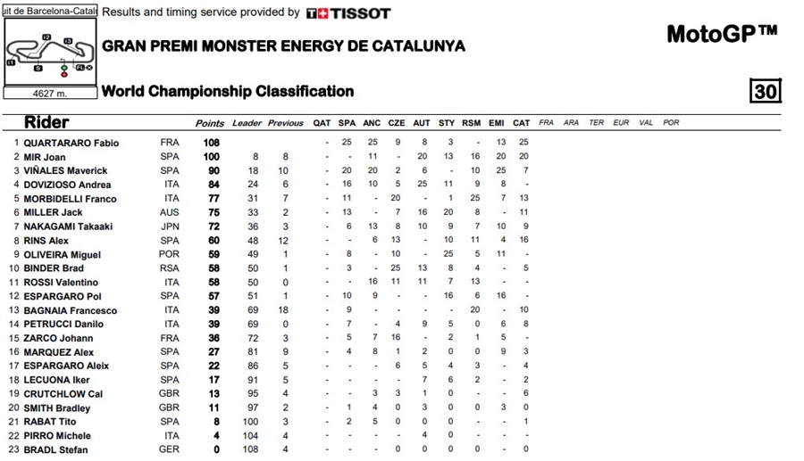 กลับมามีคะแนนสะสมเป็นผู้นำลุ้นแชมป์ประจำปีนี้อีกครั้งหลัง Fabio Quartararo ทีม Petronas Yamaha SRT สามารถคว้าชัยได้ในรายการ Gran Premi Monster Energy de Catalunya ที่สนาม Circuit de Barcelona ส่วนคู่หู Team Suzuki Ecstar ทั้ง Joan Mir และ Alex Rins พากันขึ้นโพเดียมได้อย่างน่าประทับใจ