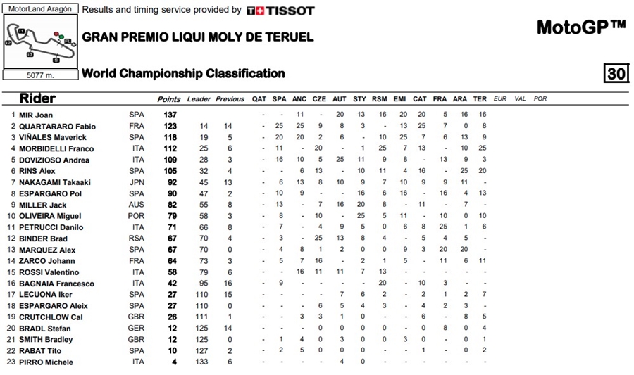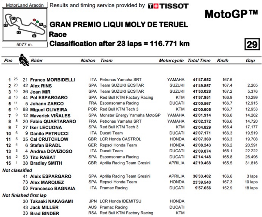 รอบที่ 20 ก็มีนักบิด Aleix Espargaro ทีม Aprilia Racing Team Gresini ต้องออกจากการแข่งขันไปอีกคน เมื่อเหลือ 3 รอบการแข่งขันยังคงเป็นของ Morbidelli ที่ทำเวลาห่าง Rins เพิ่มขึ้นเป็น 1.2 วินาที ส่วน Mir ก็ตามมาในอันดับ 3 แต่การต่อสู้เพื่อคะแนนสะสมที่ดีที่สุดในอันดับ 4 กำลังดุเดือดระหว่าง Pol Espargaro, Zarco และ Oliveira จนท้ายที่สุดก็ไม่มีการเปลี่ยนอันดับ ท้ายที่สุด Morbidelli ก็คว้าชัยชนะครั้งที่ 2 ของฤดูกาล และเค้ายังเป็นผู้ชนะที่ Aragon ที่ไม่ใช่ชาวสเปนคนแรกนับตั้งแต่ Casey Stoner ในปี 2011 และคะแนนสะสมในปี 2020 ยังคงเป็น Mir เป็นผู้นำตามมาด้วย Quarataro, Vinales, Morbidelli แม้ Mir จะนำอยู่ถึง 14 คะแนน แต่นั่นสามารถเปลี่ยนแปลงได้ในพริบตาใน 3 สนามที่เหลือ ใครจะเป็นผู้ชนะในปี 2020 คงต้องติดตามเชียร์กันแบบขาดไม่ได้แม้แต่สนามเดียว