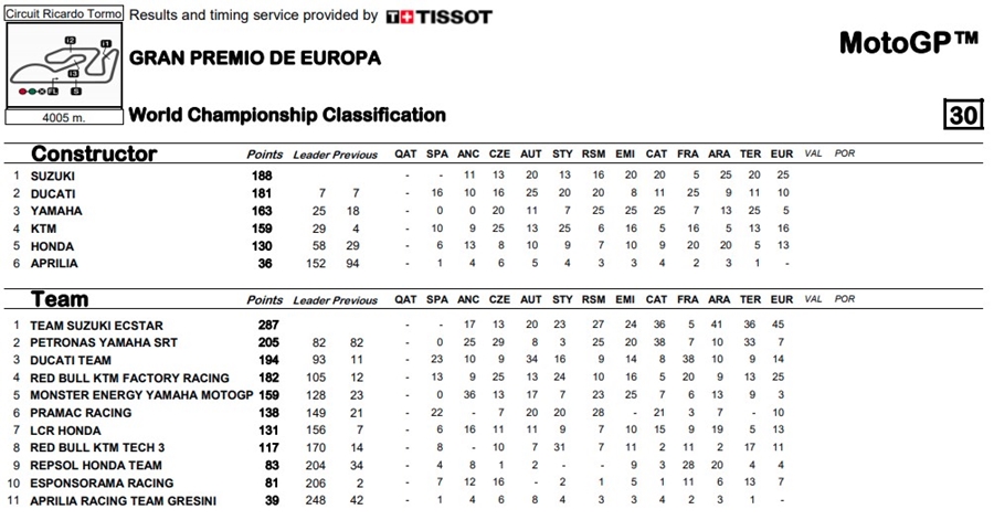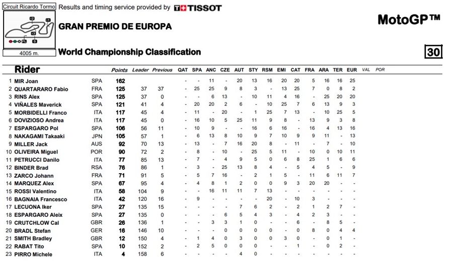 การแข่งขัน MotoGP 2020 เข้าสู่ช่วงท้ายของฤดูกาลเพื่อที่จะค้นหาว่าใครจะได้ตำแหน่งแชมป์โลกของปีนี้ไปครอง โดยสนามนี้เกิดขึ้นในรายการ Gran Premio de Europa ที่สนาม Circuit Ricardo Tormo โดยผู้ชนะในสนามนี้เป็นผู้ชนะรายที่ 9 ของปีนี้และเป็นผู้ที่มีคะแนนสะสมนำอย่าง Joan Mir จาก Team Suzuki Ecstar โดยมี Alex Rins ทีมเมทเข้ามาเป็นอันดับ 2 นับเป็นการชนะแบบ 1-2 นับตั้งแต่ปี 1982 German GP ส่วนที่ 3 คือ Pol Espargaro จาก Red Bull KTM Factory Racing ส่วน Fabio Quartararo นักบิดจาก Petronas Yamaha SRT ผู้ที่ใครๆ คาดหวังว่าเค้าจะเป็นผู้คว้าแชมป์ประจำปีในตอนต้นฤดูกาลกลับพลาดล้ม และกลับมาทำการแข่งต่อ แต่ทำได้ดีที่สุดในอันดับที่ 14 ทำให้คะแนนสะสมของ Mir นำห่าง 37 คะแนน กับการแข่งขันที่เหลืออีกเพียง 2 สนามเท่านั้น