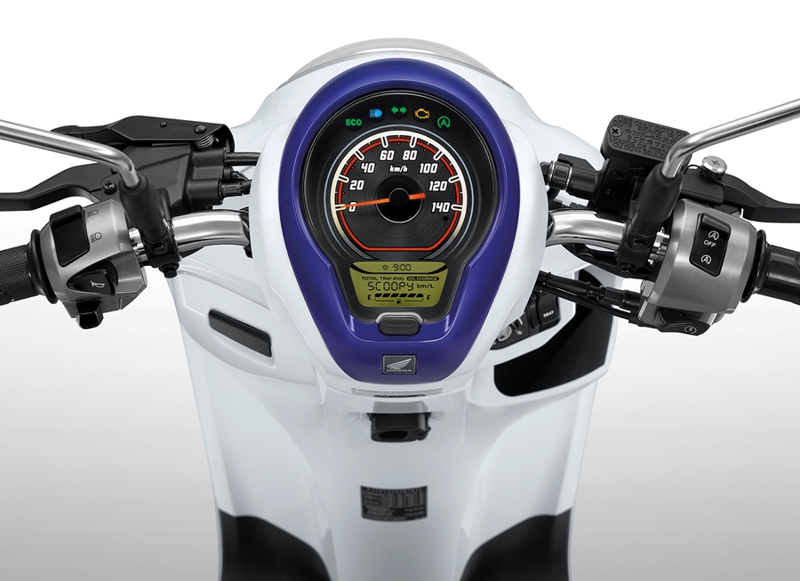 All New Honda Scoopy โดดเด่นในสไตล์โมเดิร์นด้วยไฟหน้าใหม่ Modern Ring LED Headlight เต็มวง เห็นชัด ส่องสว่างแต่ไกล ไฟท้าย LED โค้งมน เรือนไมล์ดีไซน์ใหม่ แสดงข้อมูลครบครัน ทั้งอัตราสิ้นเปลืองน้ำมัน การจับทริประยะทาง การแจ้งเปลี่ยนน้ำมันเครื่อง นาฬิกา และไฟ Eco Lamp เมื่อเข้าสู่โหมดประหยัดน้ำมัน ล้อแม็กขนาด 12 นิ้ว ดีไซน์ใหม่แบบก้านคู่ ลงตัวกับยางจุ๊บเลสหน้ากว้าง ยึดเกาะถนนดีเยี่ยม ถังน้ำมันความจุ 4.2 ลิตร ให้ความสนุกกับการขับขี่ได้ไกลกว่าเดิม