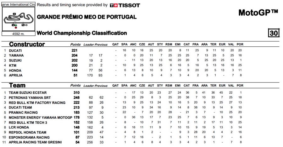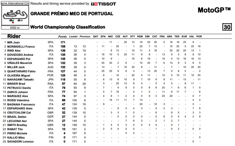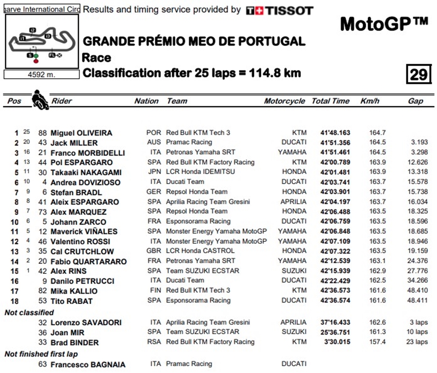 Miguel Oliveira สังกัด Red Bull KTM Tech3 นำทั้งเรซตั้งแต่ออกตัวจนคว้าชัยชนะครั้งที่ 2 ของปี 2020 ในรายการ Grande Premio MEO de Portugal ที่สนาม Algarve International Circuit ประเทศโปรตุเกส โดยการทิ้งห่างอันดับที่ 2 อยู่ถึง 3.1 วินาที ด้าน Jack Miller นักบิดจาก Pramac Racing ช่วยให้ Ducati คว้าได้แชมป์ผู้ผลิตด้วยการเข้าเส้นชัยเป็นอันดับ 2 ส่วนที่ 3 Franco Morbidelli ทีม Petronas Yamaha SRT แม้พลาดถูกแซงไปในรอบสุดท้ายแต่เค้าคือนักบิดที่ผลงานดีที่สุดของ Yamaha เลยนะ