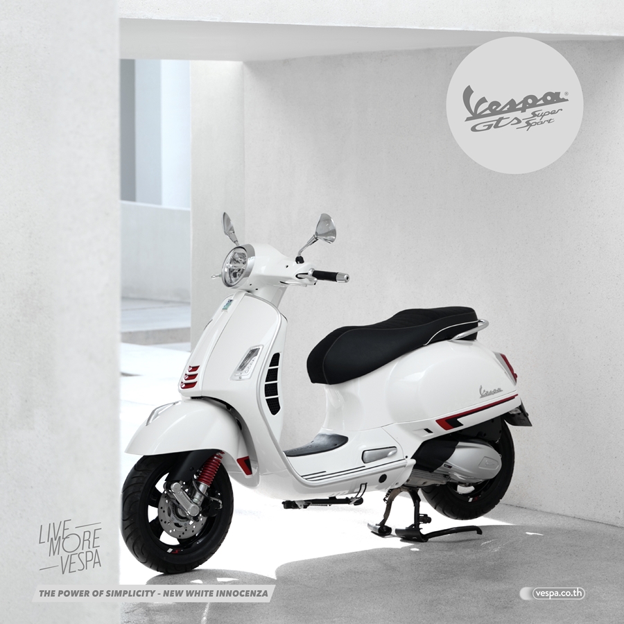 VESPA สานต่อเรื่องราวความเร็วแรงในคอนเซ็ปต์ super sport จากที่สุดแห่งเวสป้าเฟรมใหญ่ Vespa GTS ที่พร้อมปลุกจิตวิญญาณเหล่านักบิดครั้งใหม่ กับ VESPA GTS SUPER SPORT 300 HPE สีขาวใหม่ (WHITE INNOCENZA) มาพร้อมเสน่ห์แห่งความเท่เรียบง่ายแต่โดดเด่นด้วยสไตล์เรโทรโมเดิร์นสปอร์ต เติมเต็มความพรีเมี่ยมด้วยการตกแต่งสีแดงสุดโมเดิร์นรอบคัน ทั้งบังแตร 3 แถบบริเวณเน็กไท สปริงโช๊ค บังโคลนหน้า และชุดสติ๊กเกอร์ด้านข้างตัวถัง มาพร้อมเบาะปั๊มลอนและล้อแม็กสีดำเสริมลุคความเท่ ที่สำคัญยังคงขุมพลังกับสุดยอดสมรรถนะตามแบบฉบับเวสป้า จีทีเอส กับเครื่องยนต์ HPE (High Performance Engine) ขนาด 300 ซีซี เครื่องยนต์ที่ทรงพลังที่สุดของ เวสป้าเท่าที่เคยมีมา ที่มอบความรู้สึกโดดเด่น เท่ และหรูหรา เมื่อได้ขับขี่สกู๊ตเตอร์คันนี้ในทุกเส้นทาง