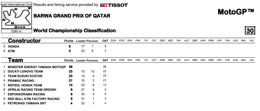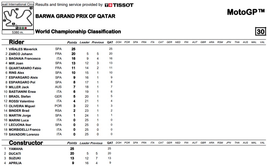 ไฮไลต์ของสนามนี้มาอยู่ที่ทางตรงสุดท้าย โดย Vinales นำสบายหายห่วงด้วยเวลากว่า 1.55 วินาที ตามมาโดย Mir ในอันดับที่ 2 โดยมี Zarco และ Bagnaia ตามมา แต่พอเข้าทางตรงด้วยความแรงของ Ducati ทำให้ Zarcoแซงผ่าน Mir ขึ้นไปได้แถมยังลากเอา Bagnaia ที่อาศัยลมดูดตาม Zarco มา กลายเป็น ทั้ง 2 คนเบียด Mir ตกโพเดี้ยมไปในที่สุด ด้าน Stefan Bradl อีกหนึ่งนักแข่งจาก Repsol Honda Team ทำผลงานได้ดีที่สุดในอันดับที่ 11 ด้าน Pol Espargaro จบในอันดับที่ 7 ส่วน Rossi จบในอันดับที่ 12 การแข่งขันในสนามที่ 2 ยังจัดขึ้นที่สนามนี้เหมือนเดิมในวันที่ 4 เมษายน ในรายการ TISSOT Grand Prix of Doha มาร่วมลุ้นกันว่าใครจะเป็นผู้นำคะแนนสะสม