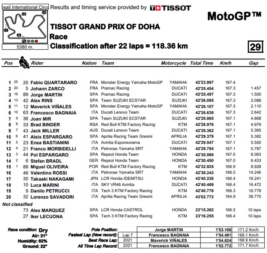 ในขณะที่อันดับที่สองได้แก่ Johann Zarco จาก Pramac Racing โดยที่ทั้งคู่เป็นนักบิดฝรั่งเศสบนโพเดียมพรีเมียร์คลาสคู่แรกนับตั้งแต่ปี 1954 ด้านอันดับสามเป็น Jorge Martin นักบิดรุกกี้จาก Pramac Racing ก็เป็นโพเดี้ยมแรกของเขาใน MotoGP ด้วยเช่นกัน