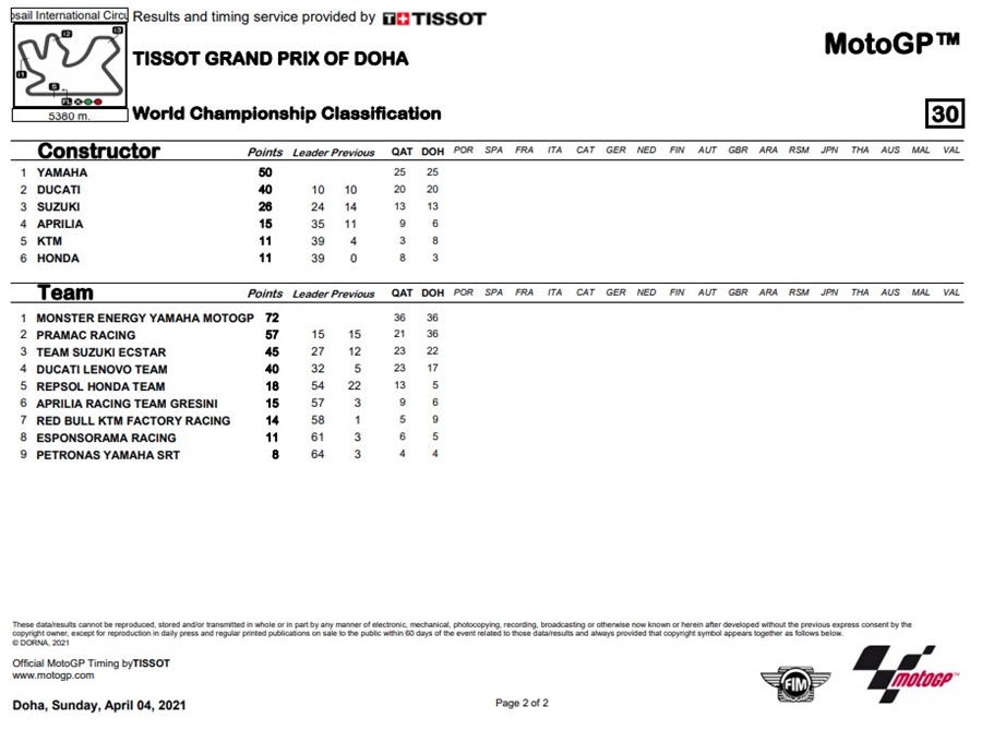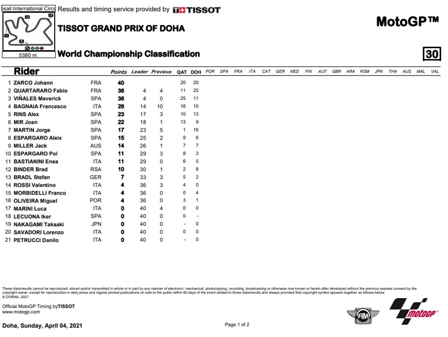 MotoGP สนามที่ 2 จบลงด้วยการที่ Zarco ขึ้นมาเป็นผู้นำในคะแนนสะสมการแข่งขันชิงแชมป์โลก โดยมี Quartararo ตามมาเป็นที่ 2 ด้วยคะแนนห่างกันเพียง 4 แต้มซึ่งเท่ากันกับ เพื่อนร่วมทีม Vinales ที่ 36 แต้ม ต้องไปลุ้นและติดตามกันต่อในสนามที่ 3 ในรายการ Grande Premio 888 de Portugal ที่สนาม Algarve International Circuit ประเทศโปรตุเกส