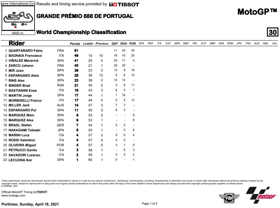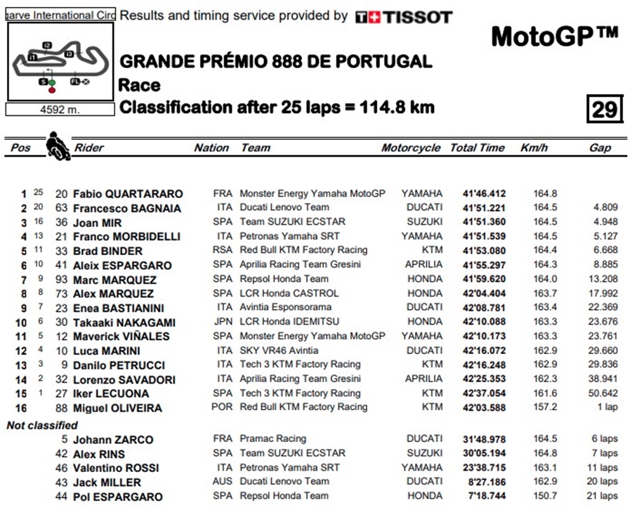 ชัยชนะใน Portimao ทำให้ Quartararo ขึ้นมาเป็นผู้นำคะแนนสะสม และเป็นการชนะ 100% ของทีมโรงงาน Yamaha ทำให้ Quartararo นำห่าง Bagnaia ถึง 15 คะแนน