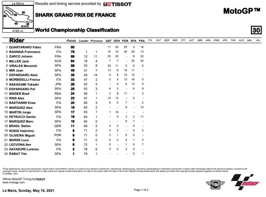 Jack Miller จาก Ducati Lenovo Team เอาชนะ French GP ถึงแม้จะโดนโทษ Long Lap Penalty ถึง 2 รอบจากการใช้ความเร็วเกินลิมิตในพิท แต่ก็สามารถคว้าชัยเหนือ 2 นักบิดเจ้าบ้านอย่าง Johann Zarco จาก Pramac Racing และ Fabio Quartararo จาก Monster Energy Yamaha MotoGP ที่ลงสนามครั้งนี้ด้วยความหวังว่าจะเป็นนักบิดชาวฝรั่งเศสที่จะคว้าชัย แต่กลับกลายเป็นนักบิดจากออสเตรเลียไปซะได้