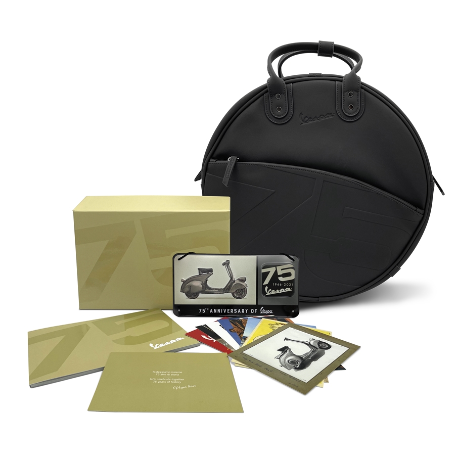Vespa 75th Anniversary Special Edition เน้นย้ำความเอ็กซ์คลูซีฟด้วย Vespa 75th Anniversary Welcome Kit ประกอบไปด้วย 1. Welcome Card 2. คู่มือรถ 3. แผ่นเพลทเวสป้าสไตล์วินเทจ 4. โปสการ์ดเวสป้าจำนวน 8 ใบ บอกเล่าประวัติศาสตร์ตลอด 8 ทศวรรษของเวสป้า และ 5. กระเป๋าสัมภาระทรงกลมจากดีไซน์กล่องเก็บยางอะไหล่รุ่นคลาสสิก (พร้อมผ้าหุ้มกันน้ำ) เป็นอีกสองรุ่นพิเศษที่เหล่านักสะสมและแฟนคลับตัวยงของเวสป้าห้ามพลาด