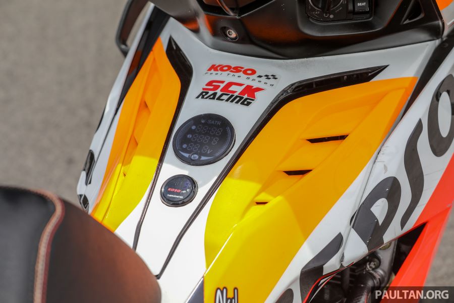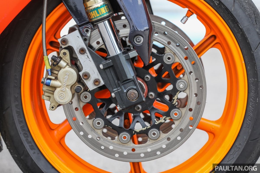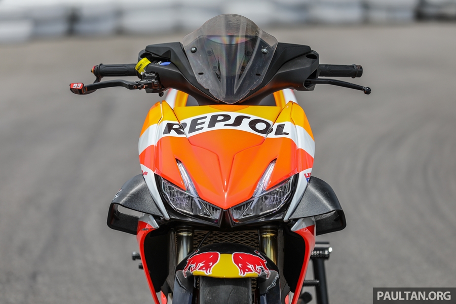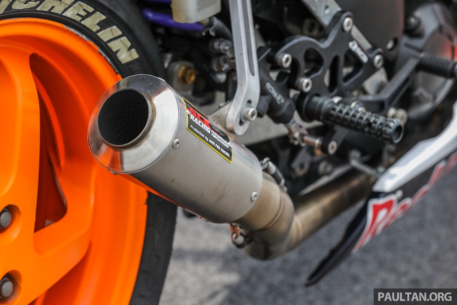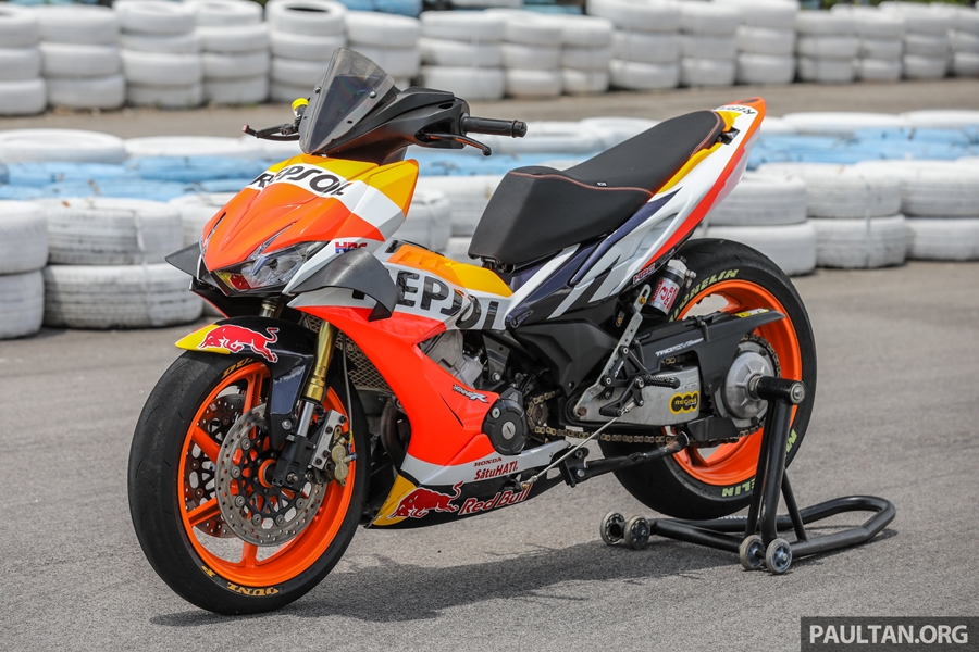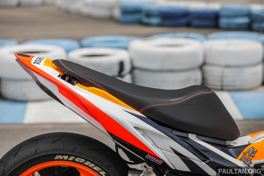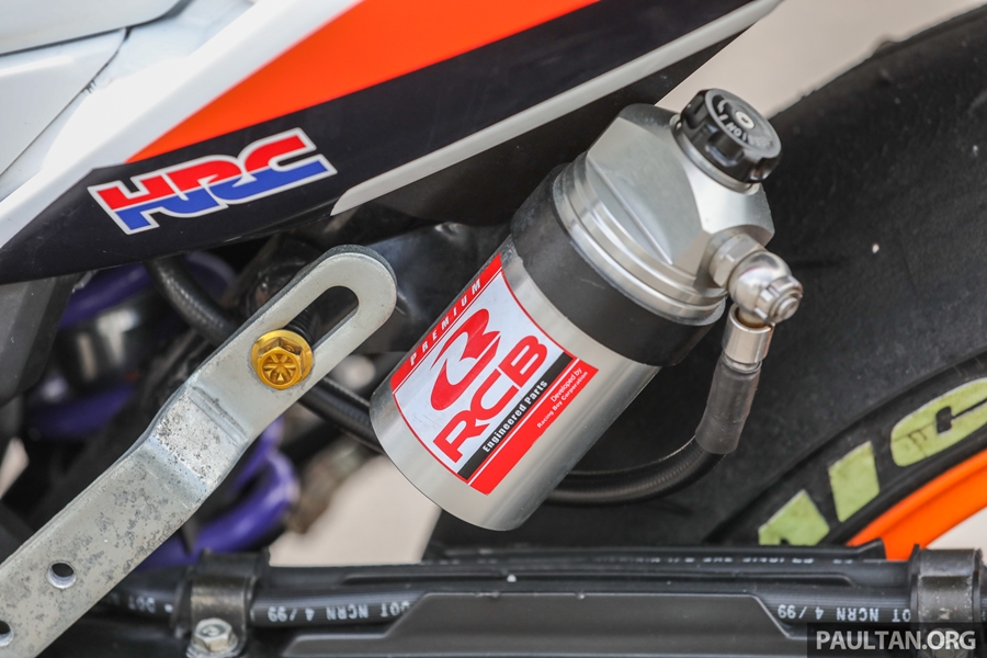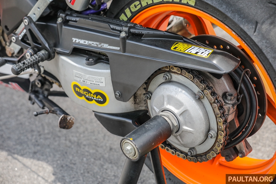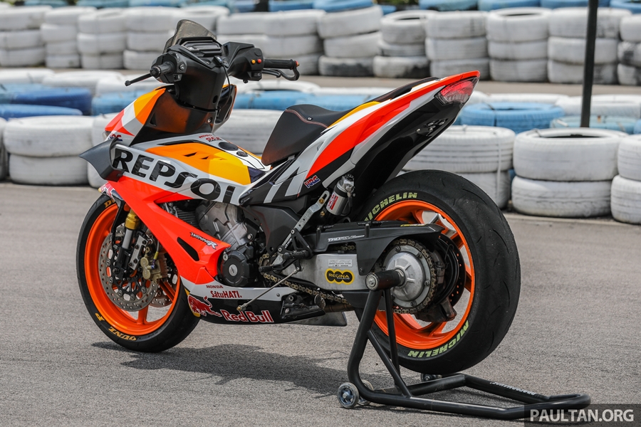 ส่วนสำคัญคือ งานยกเครื่องและพาร์ตต่างๆ ของบิ๊กไบค์ต่างมายัดลง เริ่มจากใช้สวิงอาร์มเดี่ยวของฮอนด้า VFR800 เบาะขึ้นงานแฮนด์เมดออกแบบเฉพาะ ระบบเบรกอัพเกรดระดับซูเปอร์ไบค์ ช่วงล่างของตัวแข่งจริงๆ ในรายการแข่งของมาเลเซี่ยน คัพ งานนี้ใช้กำลังและเวลามากพอสมควรกว่าจะผสมผสานทุกอย่างให้ใช้งานได้