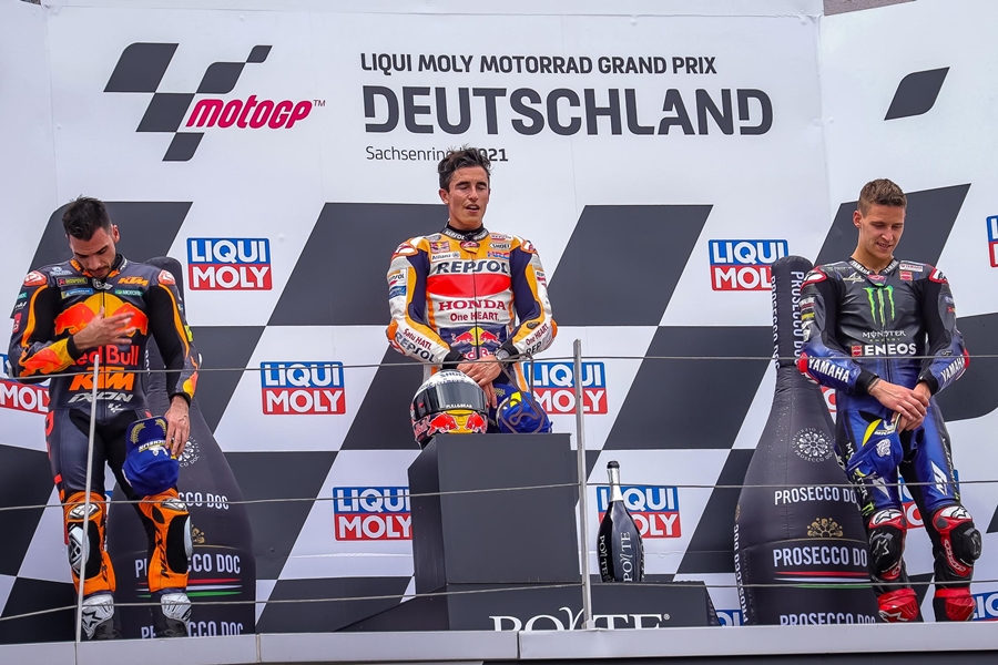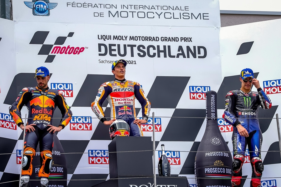 แฟนๆ MotoGP ถึงแม้จะไม่ได้เชียร์นักแข่งคนนี้ แต่อย่างน้อยการเห็นเขากลับมาสู่ชัยชนะอีกครั้งก็เป็นเรื่องที่น่ายินดีไม่น้อย โดยในรายการ Liqui Moly Motorrad Grand Prix Deutschland ถือเป็นการกลับมาของ King of the Ring อย่าง Marc Marquez แห่ง Repsol Honda Team ที่หวนกลับมาขึ้นโพเดี้ยมอันดับ 1 ในสนาม Sachsenring