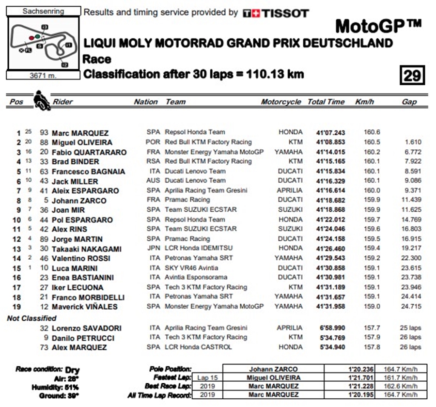 สนาม Sachsenring เป็นสนามที่ Marc Marquez กวาดชัยชนะมาแล้ว 10 ครั้ง โดยการแข่งขัยในรายการ Liqui Moly Motorrad Grand Prix Deutschland จะทำการแข่งขันกันทั้งหมด 30 รอบ การแข่งขันเริ่มต้นด้วยความดุเดือดโดยมี Miguel Oliveira จาก Red Bull KTM Factory Racing พยายามต่อสู้เพื่อท้าทาย Marquez แต่สุดท้ายก็ทำได้เพียงอันดับที่ 2 ในขณะที่ Fabio Quartararo จาก Monster Energy Yamaha MotoGP ถึงแม้จะได้อัดับ 3 แต่ก็ยังยิ้มออกเพราะยังเป็นผู้นำคะแนนสะสมชิงแชมป์โลก