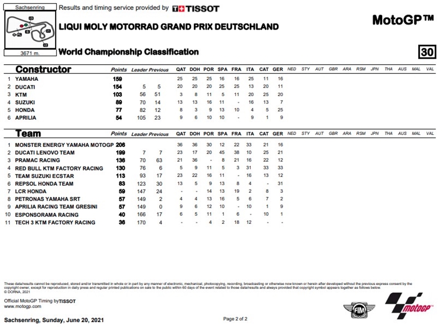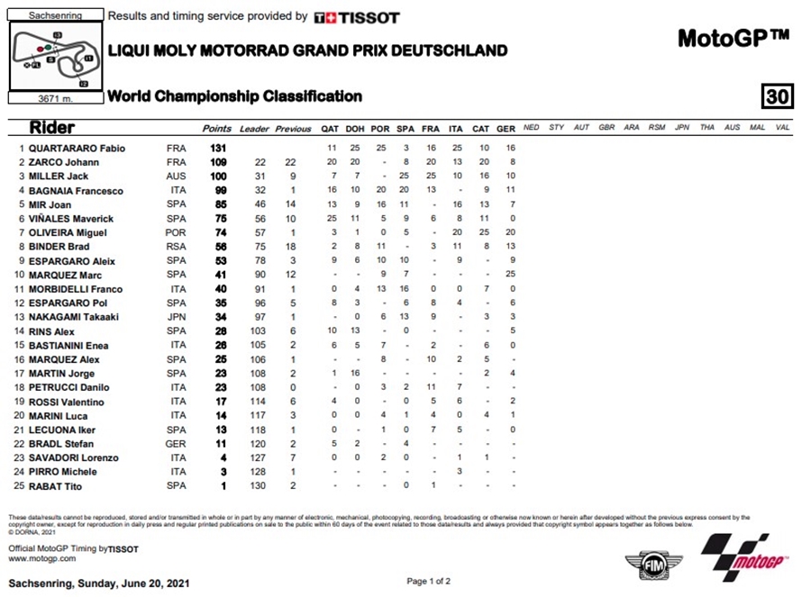 ด้าน Quartararo ถึงแม้จะได้ที่ 3 แต่ก็เพียงพอที่จะยังคงเป็นผู้นำในตารางคะแนนสะสม โดยทำคะแนนนำห่าง Zarco ไปถึง ​​​​22 แต้ม