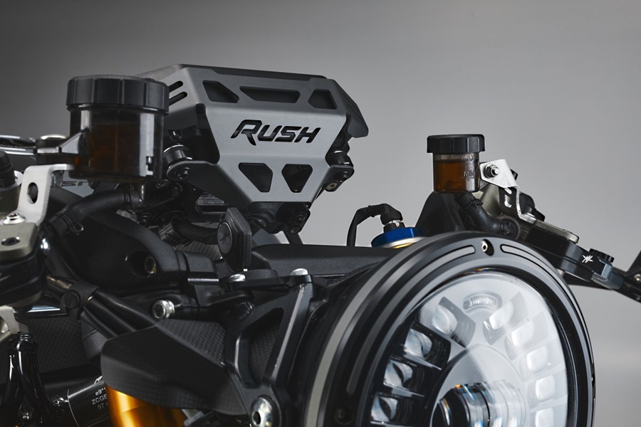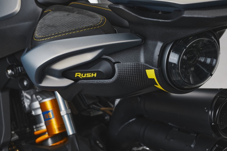 เกียร์ 6 สปีด คลัทช์ใหม่พร้อมเซ็นเซอร์ Quick Shifter ที่ทำให้เข้าเกียร์ง่ายแม่นนำขึ้น Rush 1000 มีน้ำหนัก 186 กก. บรรจุเชื้อเพลิงในถังขนาด 16 ลิตร มีระบบกันสะเทือน Ohlins หน้าเสริมด้วยโช้ค NIX EC 43 มม. พร้อมระบบกันสะเทือนแบบอิเล็กทรอนิกส์แบบปรับได้ ด้านหลังใช้โช้คเดี่ยว Ohlins EC TTX ปรับได้เช่นกัน