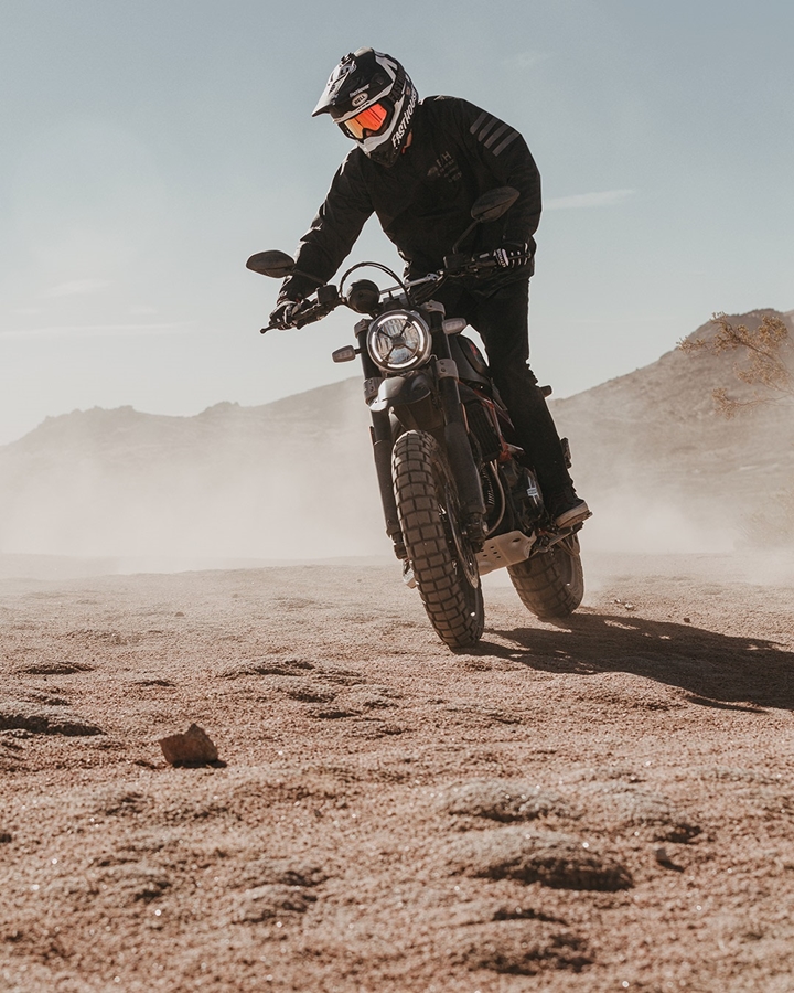 ควมคุมและหยุดรถได้ดั่งใจด้วยระบบเบรกหน้าใช้ดิสก์เบรกเดี่ยวขนาด 330 มิลลิเมตร คาลิปเปอร์ Brembo แบบ 4 พอท และระบบเบรกหลังใช้ดิสก์ขนาด 245 มิลลิเมตร พร้อมด้วยคาลิปเปอร์ 1 พอท เป็นอุปกรณ์มาตรฐานในรถรุ่นนี้ เท่านั้นยังไม่พอ Scrambler Desert Sled Fasthouse มาพร้อมกับความดุดันด้วยล้อและซี่ลวดสีดำ ล้อหน้าขนาด 19 นิ้ว และล้อหลังขนาด 17 นิ้ว พร้อมยาง Pirelli SCORPION™ RALLY STR ออพชั่นแน่น แต่กลับมีน้ำหนักที่ไม่รวมของเหลวเพียง 193 กิโลกรัม เท่านั้น พร้อมความจุถังน้ำมันมากถึง 13.5 ลิตร