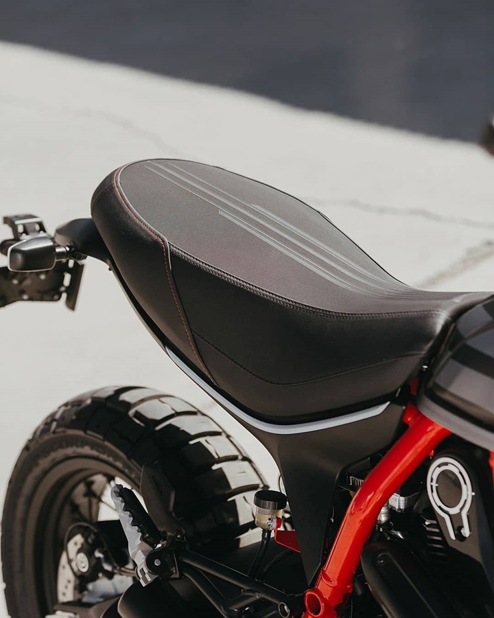 การออกแบบเบาะนั่งใหม่ทำจากวัสดุพิเศษที่สามารถกันลื่นได้ ทำให้ผู้ขับขี่อยู่ในตำแหน่งการขี่ที่สะดวกสบาย และรู้สึกปลอดภัยในทุกสถานการณ์ การออกแบบลวดลายบนถังน้ำมันนั้นได้แรงบันดาลใจมาจากรถที่ “Jordan Graham” ได้รับชัยชนะจากการแข่งขัน โดยใช้สีดำด้านเป็นหลักและใช้สีเทาตัดเป็นลายเรขาคณิต พร้อมโลโก้กากบาท (X)  สีแดงของ Scrambler Desert Sled วางคู่กับโลโก้ Fasthouse ที่ข้างถังน้ำมันอีกด้วย บังโคลนหน้ายกสูง มาพร้อมระบบกันสะเทือนแบบหัวกลับขนาด 46 มิลลิเมตร มีระยะยุบตัวได้ถึง 200 มิลลิเมตร และระบบกันสะเทือนหลังสามารถปรับ Preload และ Rebound ได้ ถือได้ว่ามีดีเอ็นเอของความเป็นออฟโรดอยู่ทุกมุมมอง