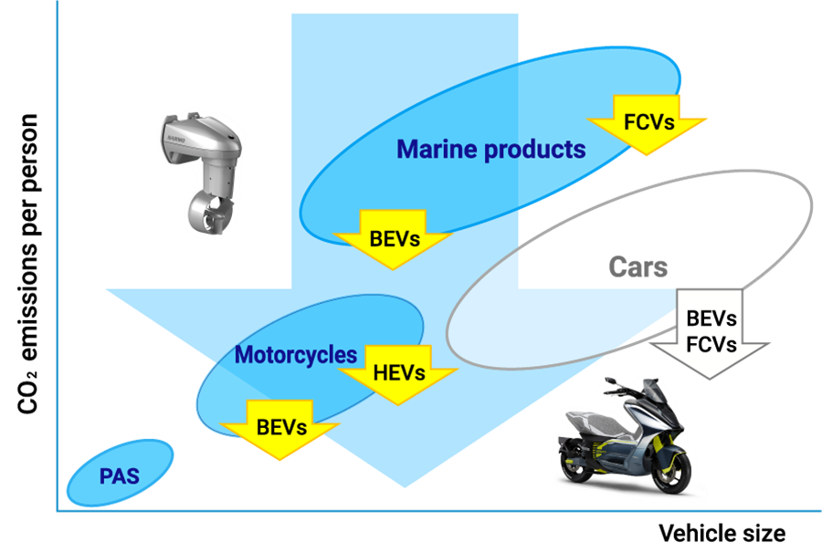 โดยแผนงานระยะสั้นภายในปี 2035 คือ การลดค่า CO2 เป็นสำคัญ ขั้นแรกเริ่มจากระดับการทำงานภายในองค์กรก่อนจากนั้้นจึงไปถึงส่วนผลิตภัณฑ์ ซึ่งในประกาศข่าวของทางยามาฮ่ามีใจความสำคัญดังนี้ "ยามาฮ่า มอเตอร์ เดินหน้าต่อเนื่องเพื่อลดมลพิษโดยได้ทำฟุตปริ้นต์ขนาดย่อมเกี่ยวกับสิ่งแวดล้อม และค่า CO2 ของตลอดอายุการใช้งานผลิตภัณฑ์ นับตั้งแต่วัตถุดิบ ผ่านขบวนการผลิต ใช้งานและทิ้ง นอกจากนี้ก็ได้เตรียมตอบรับสังคม carbon neutrality ก่อนปี 2050 ด้วยการเตรียมนำเสนอสิ่งใหม่ๆ ที่เป็นเอกลักษณ์เข้าไปในจักรยานยนต์ยามาฮ่าด้วย"