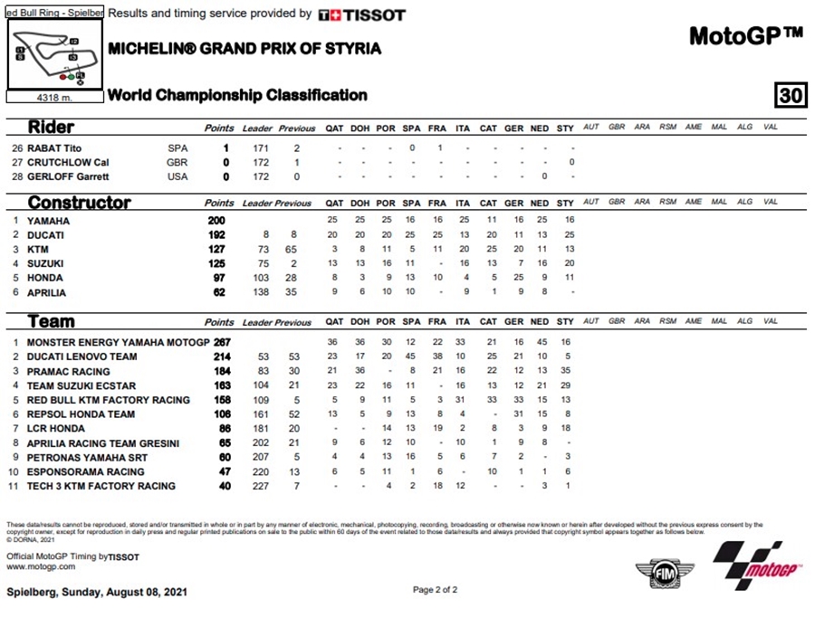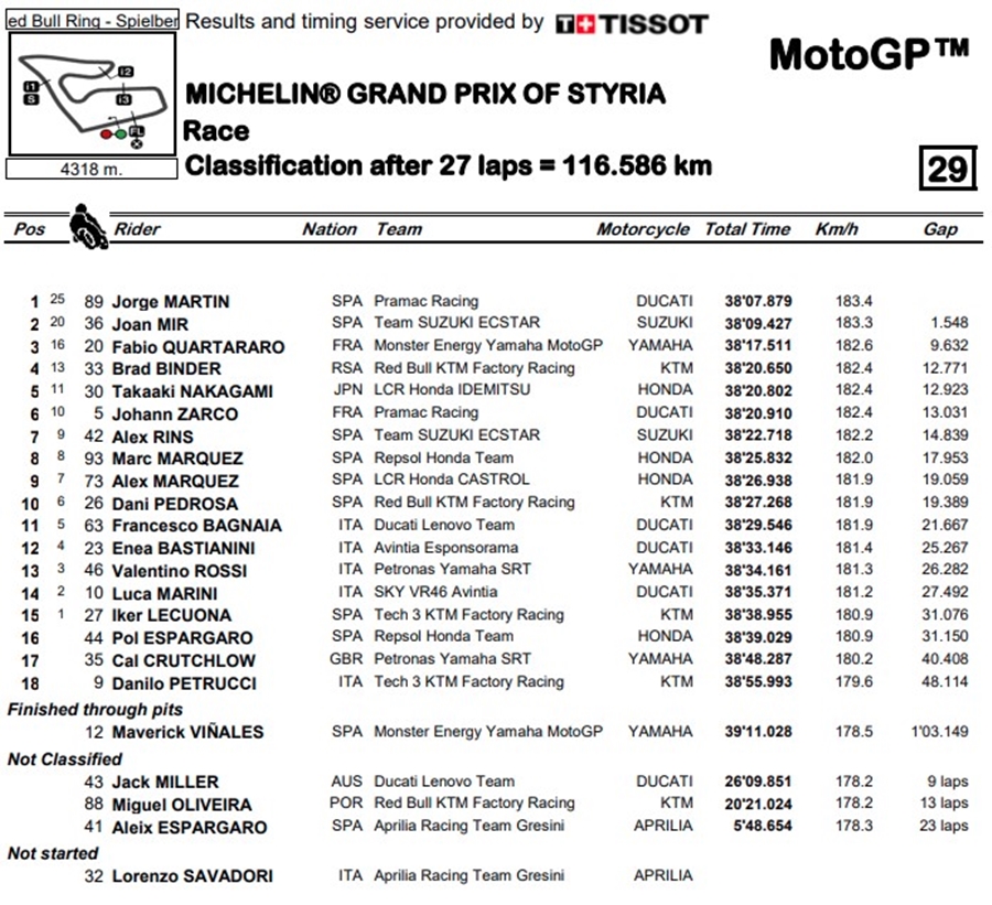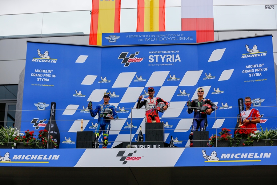 การแข่งขันรายการ Michelin® Grand Prix of Styria ที่สนาม Rad Bull Ring ในรุ่น MotoGP นักแข่งที่คว้าโพลได้คือ Jorge Martin จาก Pramac Racing โดยมี Francesco Bagnaia จาก Ducati Lenovo Team และ Fabio Quartararo จาก Monster Energy Yamaha MotoGP ร่วมออกสตาร์ทจากแถวหน้า ทันทีที่การแข่งขันเริ่มต้นขึ้น เป็น Martin ที่ออกตัวได้ดีกว่า ตามมาด้วย Bagnaia และ Joan Mir จาก Team SUZUKI ECSTAR ด้าน Marc Marquez จาก Repsol Honda Team ก็ปะทะกับ Aleix Espargaro จาก Aprilia Racing Team Gresini แต่ในรอบต่อมา กลับเป็น Bagnaia ที่ขึ้นนำขณะกำลังจะขึ้นรอบถัดไปก็เกิดอุบัติเหตุ