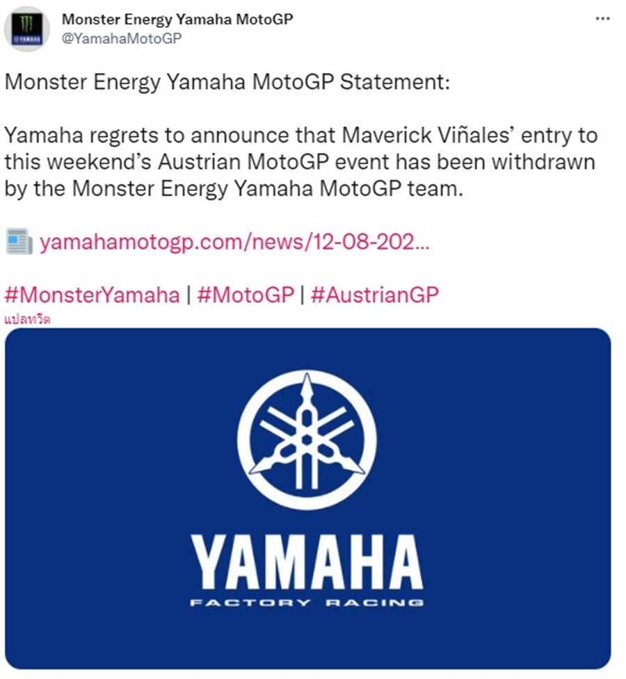 กลายมาเป็นประเด็นให้ได้ติดตามอีกครั้งเมื่อ Maverick Vinales ของ Monster Energy Yamaha MotoGP ถูกทีมออกมาประกาศถอนชื่อ จากการแข่งขัน Bitci Motorrad Grand Prix von Osterreich ในสุดสัปดาห์นี้ โดยให้เหตุผลว่า "รถของบิญาเลสมีปัญหา ซึ่งไม่สามารถอธิบายได้" ในช่วงท้ายของสนามที่แล้ว Yamaha จึงตัดสินใจถอดชื่อ Vinales ออกจากการแข่งขันใน Red Bull Ring อาทิตย์นี้