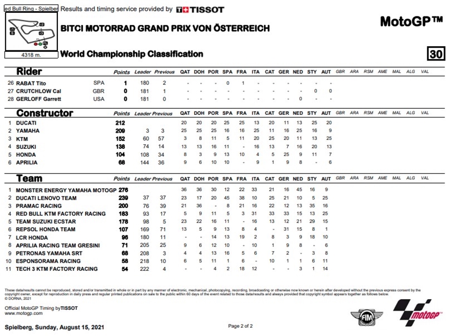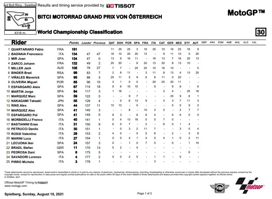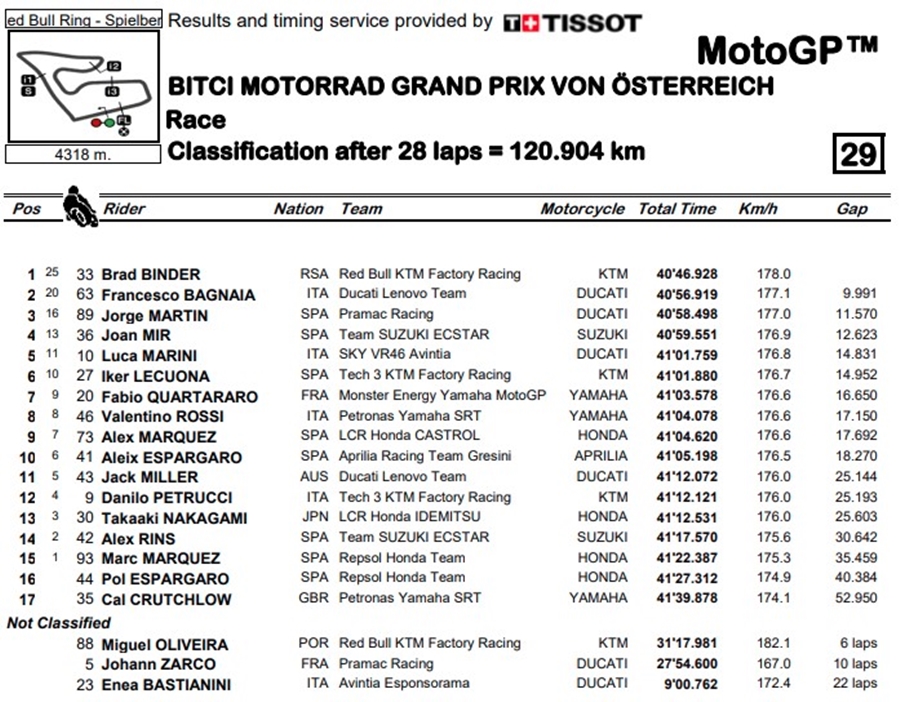 ก่อนการแข่งขัน Bitci Motorrad Grand Prix von Osterreich เป็นการแข่งขันที่ดุเดือดที่สุด โดยที่กล้องถ่ายทอดสดจากในสนามเริ่มสังเกตได้ว่ามีเม็ดฝนตกมาปรอยๆ โดยนักแข่งส่วนใหญ่เลือกใช้ยางแบบ Hard กับ Medium ชัยชนะในสนามนี้ตกเป็นของ Brad Binner นักแข่งจากทีม Red Bull KTM Factory Racing ผู้ที่กล้าหาญขี่ด้วยยางสลิคต่อไปอีก 3 รอบแม้ฝนตกหนัก ด้าน Francesco Bagnaia จาก Ducati Lenovo Team คว้าตำแหน่งที่ 2 และ Jorge Martin จาก Pramac Racing เป็นอันดับ 3 โดยในรอบสุดท้ายยังสามารถแซงผ่านนักแข่งได้ถึง 6 คันอีกด้วย