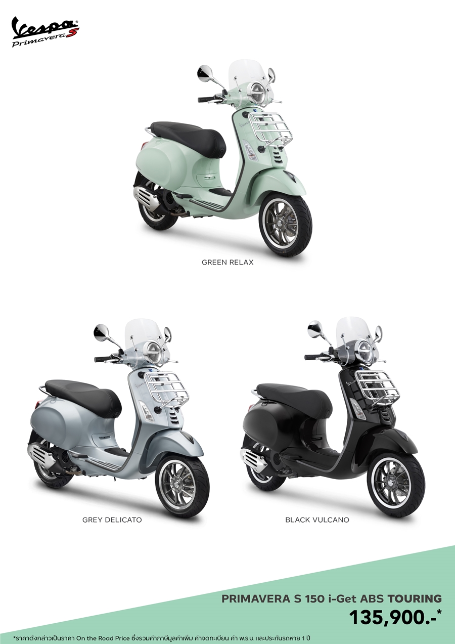 สำหรับ Vespa Primavera S 150 i-Get ABS Touring ทั้ง 3 เฉดสี มาในราคา 135,900 บาท (ราคานี้เป็นราคา ON THE ROAD PRICE ที่รวมภาษีมูลค่าเพิ่ม ค่าจดทะเบียน พ.ร.บ. ประกันรถหายและ Welcome kit)