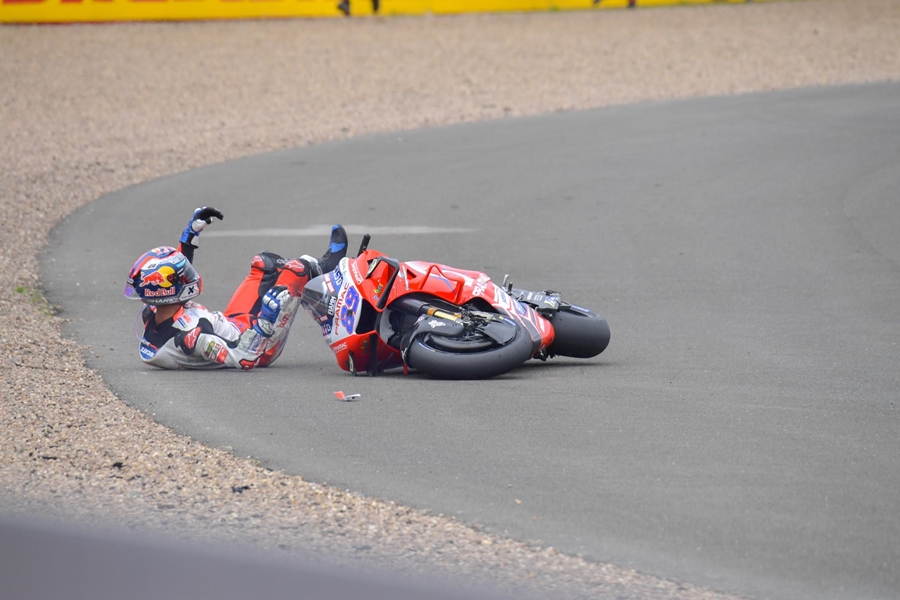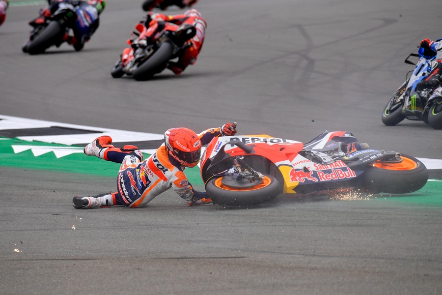 แล้วในโค้งต่อเนื่องราวๆ โค้งที่ 7-8 Marc Marquez จาก Repsol Honda Team ที่พยายามไล่ล่าอันดับก็เกิดพลาดล้มเป็นเหตุให้ไปเกี่ยวกับ Jorge Martin จาก Pramac Racing เป็นเหตุให้ Marquez ต้องออกจากการแข่งขัน ด้าน Martin ถึงแม้จะนำเราเข้าทำการแข่งขันได้ แต่พอรอบถัดไปก็ต้องเข้าพิท และออกจากการแข่งขันไปอีกคน