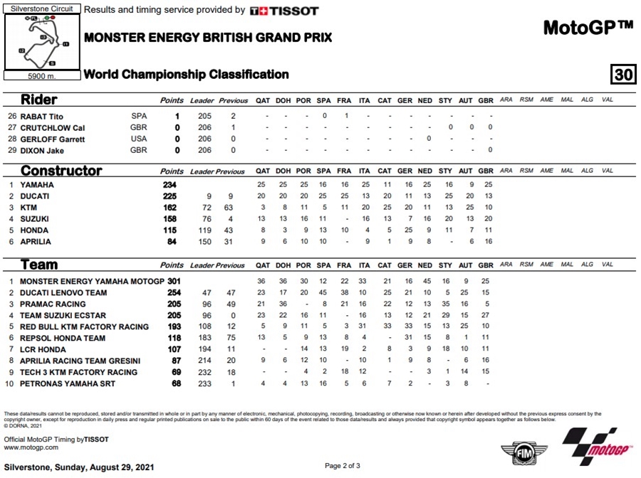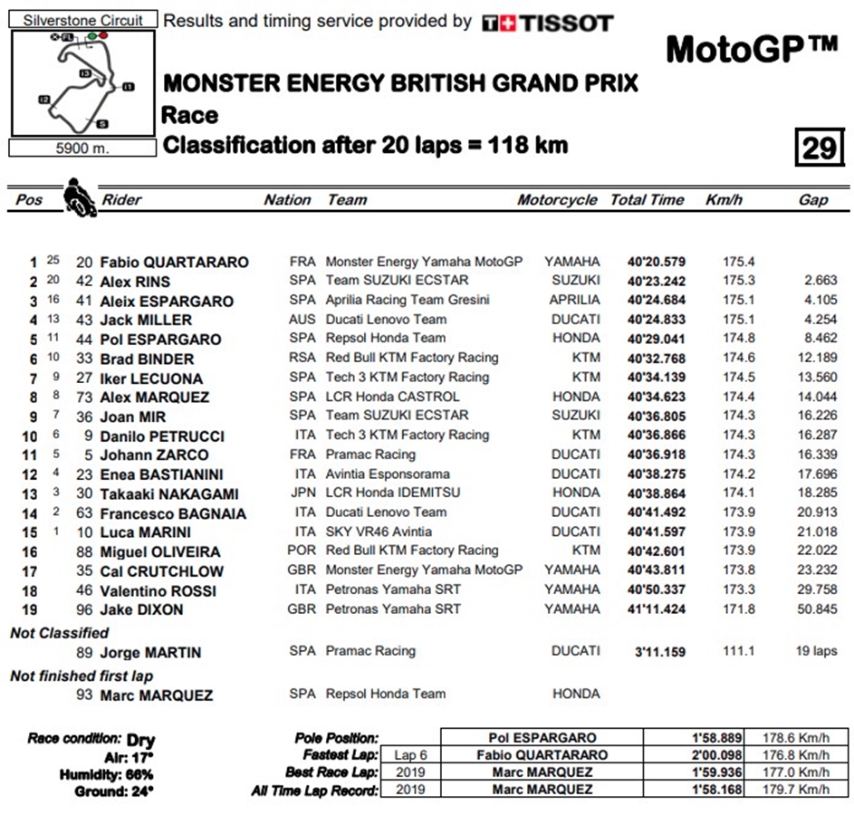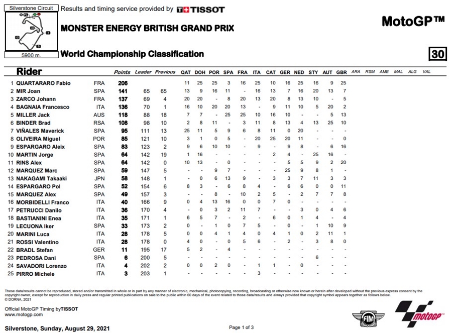 ชัยชนะใน #BritishGP ทำให้ Fabio Quartararo มีคะแนนสะสมห่างถึง 65 คะแนน ด้านทีม Aprilia Racing Team Gresini ได้ฉลองชัยจากการขึ้นโพเดี้ยมโดย Aleix Espargaro