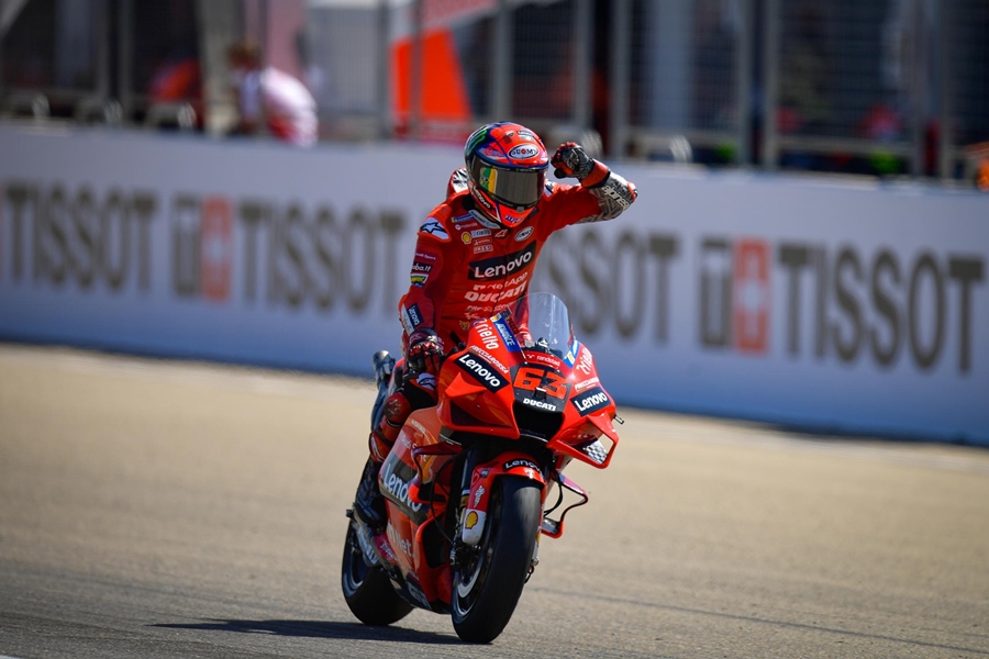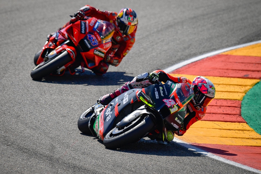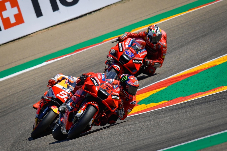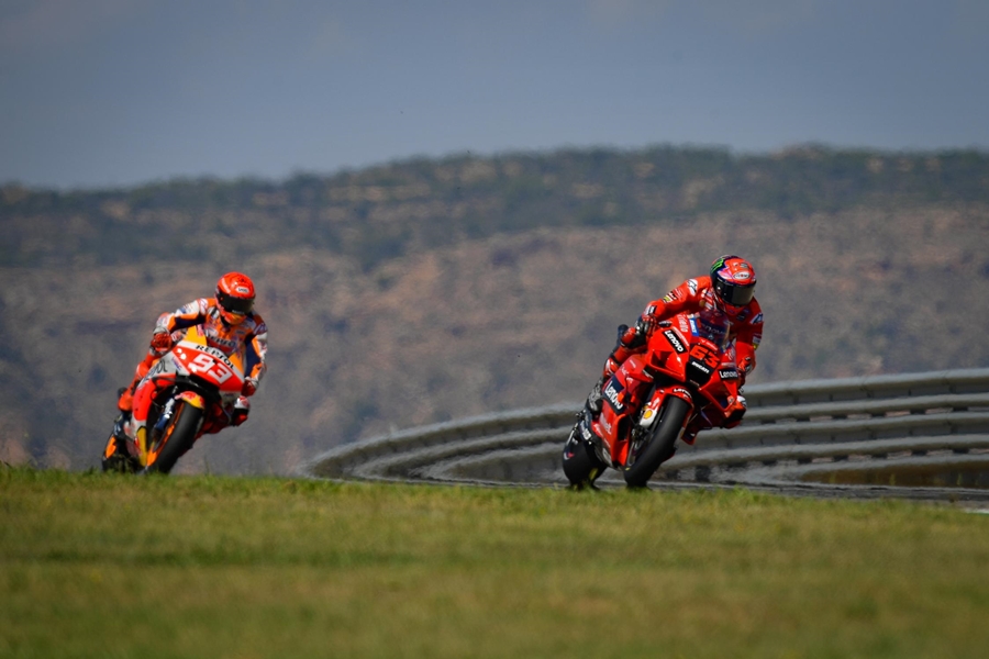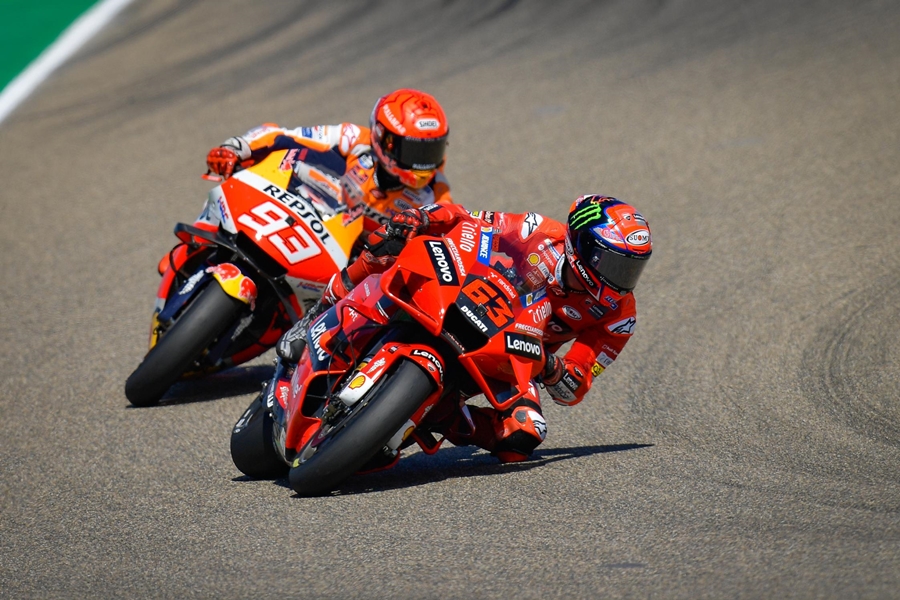 Bagnaia ตั้งการ์ดกันแชมป์โลกแปดสมัยอย่าง Marquez ได้อย่างสุดมัน สุดท้ายเป็นนักบิดจากอิตาลีที่คว้าแชมป์แรกใน MotoGP ที่ Aragon