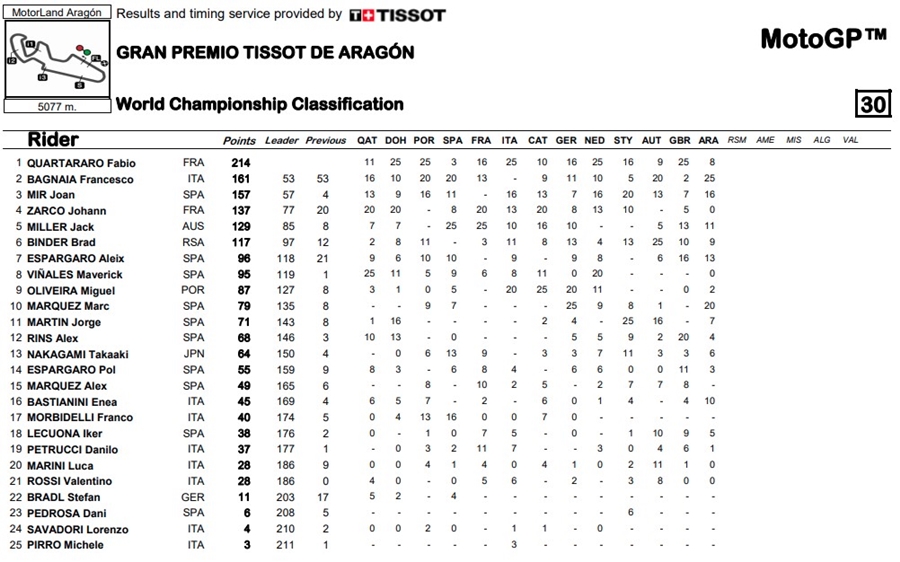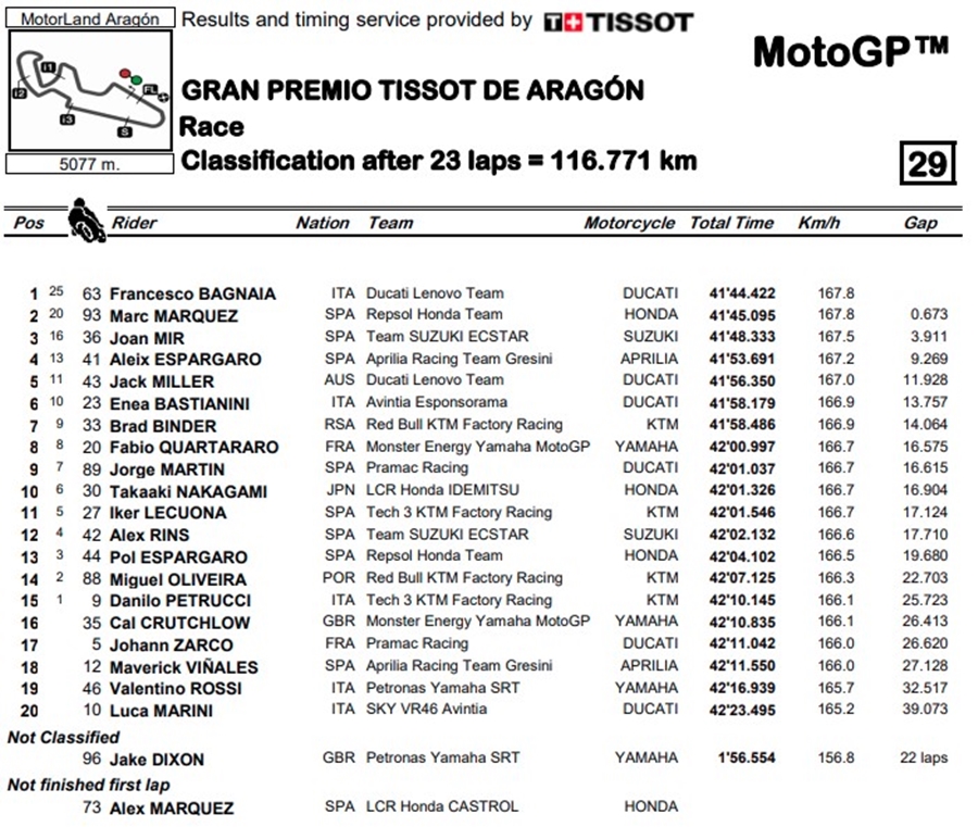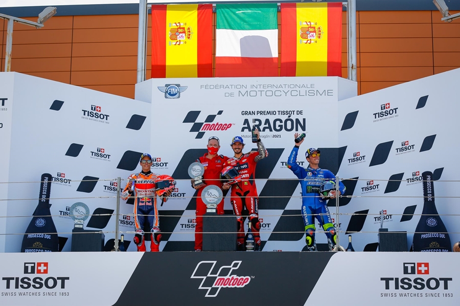 การแข่งขัน MotoGP ที่เพิ่งผ่านไปล่าสุดในรายการ Gran Premio TISSOT de Aragon ที่สนาม MotorLand Aragon ซึ่ง Francesco Bagnaia จาก Ducati Lenovo Team ในที่สุดก็เป็นผู้ชนะในรายการ MotoGP หลังจากได้ดวลกันกับ Marc Marquez จาก Repsol Honda Team ท้ายที่สุดเป็น Bagnaia ที่คว้าชัยไป ส่วนแชมป์โลกคนล่าสุดอย่าง Joan Mir จาก Team Suzuki Ecstar ได้ตำแหน่งที่ 3 ในสนามนี้