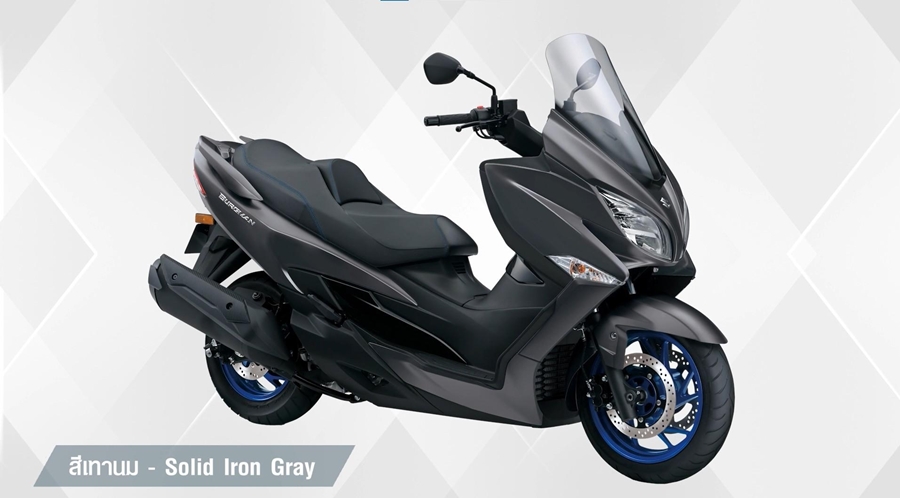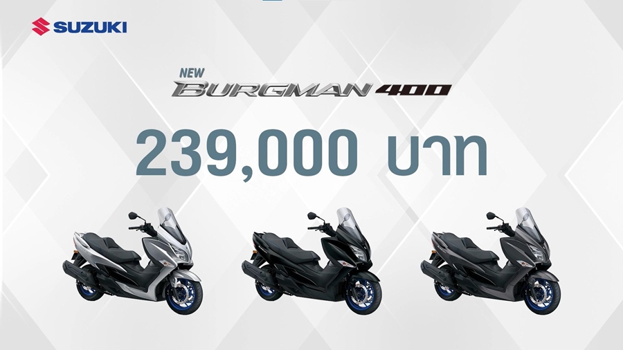 New Suzuki Burgman 400 มีสีใหม่ให้เลือกถึง 3 สี พรีเมี่ยม ได้แก่ สีเงินด้าน -Metallic Mat Sword Silver (QKA), สีเทานม - Solid Iron Gray (YUD)และ สีดำด้าน - Metallic Mat Black No.2 (YKV) ด้วยราคาที่พิเศษที่สุดในคลาส เพียง 239,000 บาท กับการครอบครองรถสกู๊ตเตอร์ที่เพียบพร้อมด้วยความหรูหรา พรีเมี่ยมที่สุดในคลาสเดียวกันในคุณภาพระดับเวิลด์คลาสที่ผ่านขั้นตอนการผลิตพิถีพิถันจากประเทศญี่ปุ่น Made in Japan ทั้งคัน สนใจสามารถสัมผัสตัวจริงได้ที่ผู้แทนจำหน่ายรถจักรยานยนต์ซูซูกิ บิ๊กไบค์ ทั่วประเทศ